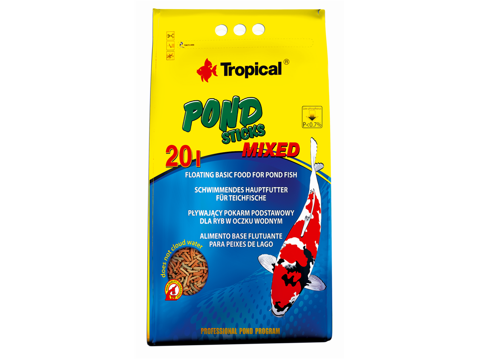 KOI & GULDFISK FARVE STICKS farveforbedrende foderstickstil havedamsfisk inkl. koikarper. På grund af den specielle struktur af sticksene flyder de i overfladen i meget lang tid. Det gør det lettere at observere fiskene og holde øje med mængderne af spist foder. En usædvanligt rig formel der imødekommer alle fiskenes ernæringsmæssige behov og sikrer stabil vækst. Anbefales fra det tidlige forår indtil det sene efterår ved temperaturer over 10 °C og i vintersæsonen til fisk, der holdes indendørs.