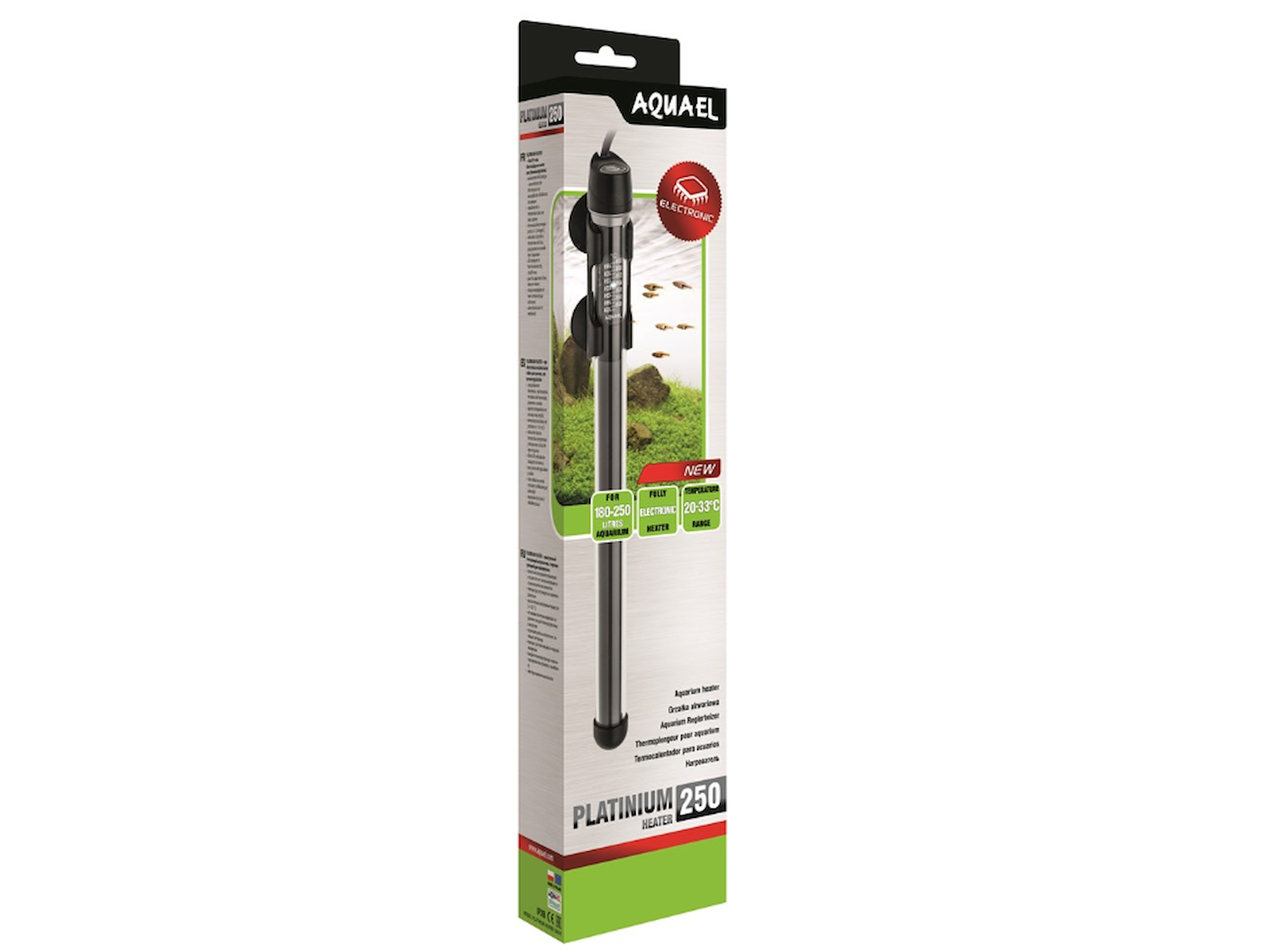 PLATINIUM HEATER er en innovativ glasvarmer produceret af AQUAEL. Den er udstyret med en elektronisk højpræcisionstermostat. Temperaturerne kan indstilles i området mellem 20 og 33 °C og opretholdes med en nøjagtighed på 0,8 °C (+/-0,4 °C). Varmelegemet kan prale af ONE TOUCH-systemet til intuitiv temperaturjustering, en keramisk køleplade og et indbygget elektronisk termometer. Hver prøve gennemgår computerstøttet test på AQUAELs laboratorium. Da termostaten er fuldt elektronisk styret, har disse varmeapparater, i modsætning til andre kommercielt tilgængelige produkter, ingen mekaniske kontakter eller andre slid-udsatte bevægelige dele. Dette garanterer en lang, fejlfri levetid for at opretholde optimale termiske forhold i tanken. PLATINIUM HEATER-serien omfatter 8 modeller med effekt fra 25 til 300 W.