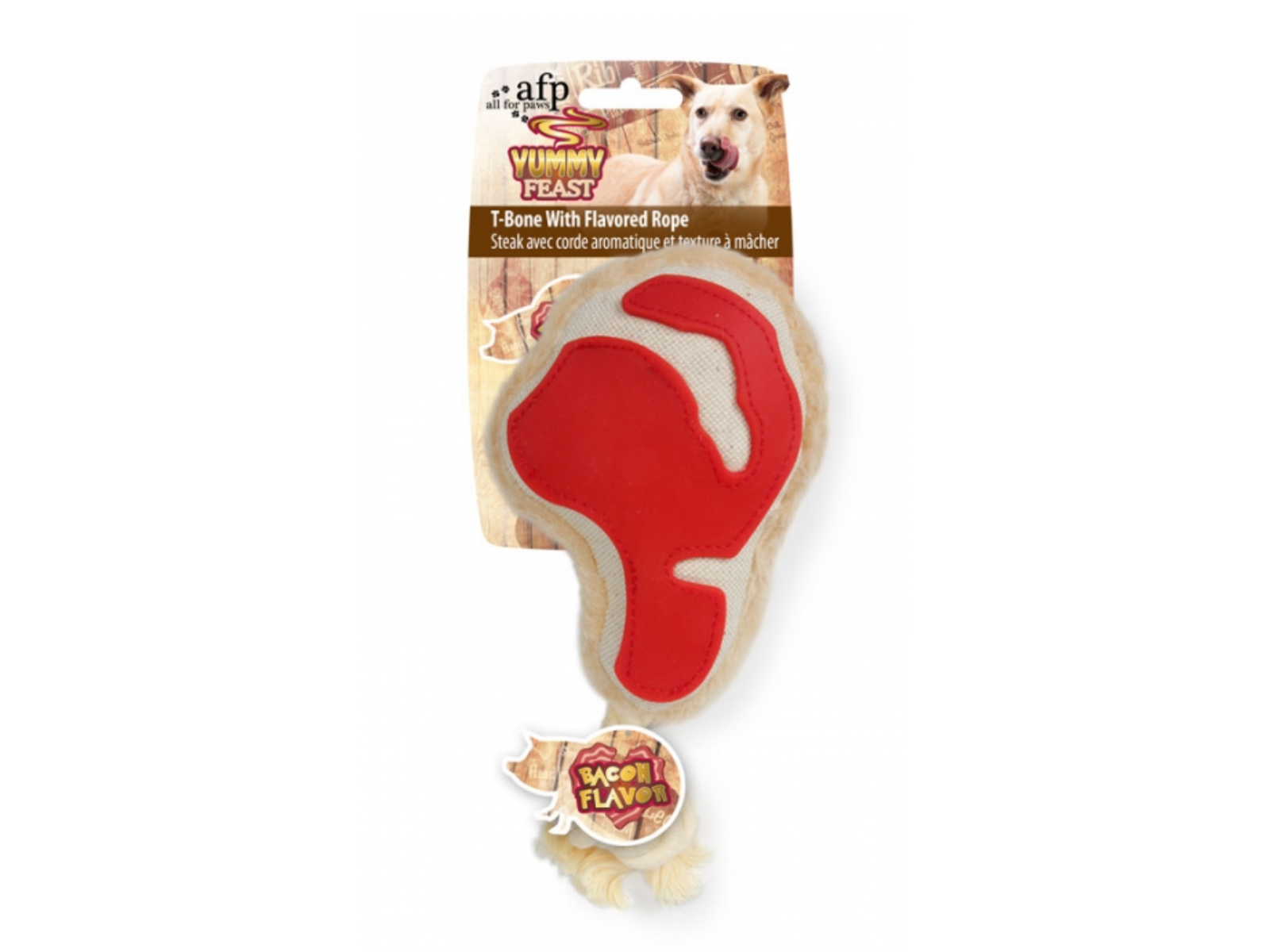 YUMMUY feast T bone er udstyret med et tyggereb, som hunden enten kan torvrtrække i, eller tygge i til kløen i tænderne er forsvundet, eller for ren og skær leg.