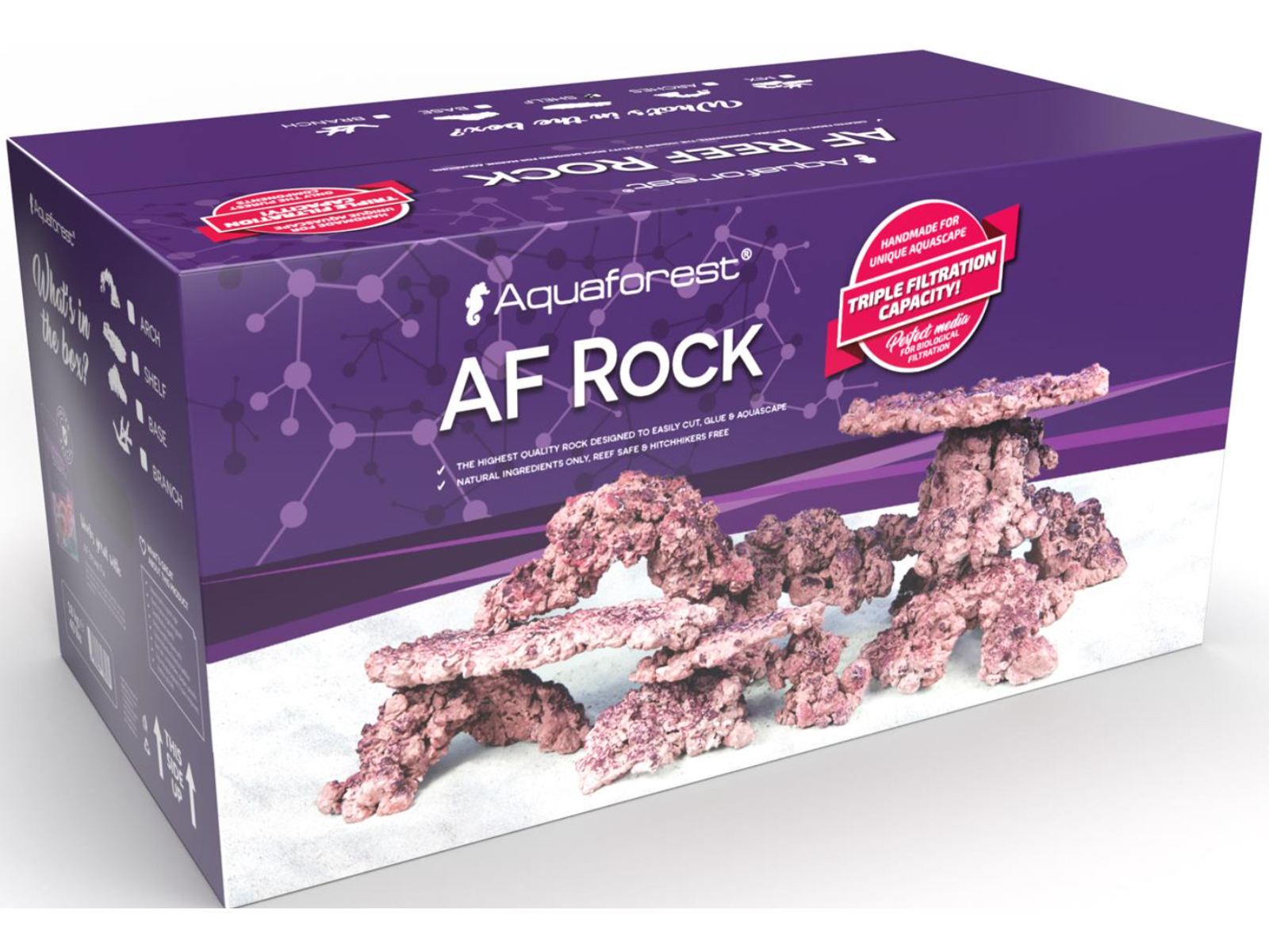 • Kan forventes at blive modtaget med afbrækkede hjørner, da det er en kunstigt fremstillet sten. Stenen kan derfor knække, slås af i hjørnerne, eller lignende. Dette dækkes IKKE på reklamation, da det er stenenes intentionelle brug. Skabt af helt naturlige ingredienser, rock af højeste kvalitet designet til marine akvarier. Høj æstetik og håndlavet fremstillingsproces får AF Rock til at ligne naturlig sten fra koralrev. På grund af den høje porøsitet letter det bakteriebinding og fungerer perfekt som filtreringsmedie. I modsætning til de sten, der almindeligvis findes på markedet, var AF Rock beregnet til en effektiv filtreringsproces. Brugen af ​​de bedste, økologiske og fuldt sikre pigmenter gjorde det muligt at skabe en sten med meget dekorative kvaliteter. AF Rock skader ikke miljøet og er i modsætning til levende sten fri for forurenende stoffer, uønskede alger og parasitter. I modsætning til den levende sten er brugen af ​​AF Rock fri for skadelige og invasive organismer såsom valonia, aiptasia, dinoflagellat, bryopsis, AEFW og uønskede krabber. Sammensætningen af ​​klippen giver optimale betingelser for udviklingen af ​​livet i havet og er helt sikkert for indbyggerne i akvariet. AF Rock er et ideelt medium til bakterieaflejring, så det understøtter biokemiske processer og garanterer langsigtet biologisk balance i tanken. Fjelden vil løbende understøtte filtreringsprocesser, stabilisere parametre og lette udviklingen af ​​livet i havet. Stenen kan skæres og brydes, samt frit kombineres med Stone Fix. Håndlavet fremstillingsproces af AF Rock garanterer det unikke ved hvert af sættene og sikrer også den eksklusive form af hvert element. Høj porøsitet sikrer lav vægt og et fremragende vægt/volumenforhold. På grund af dette er AF Rock meget lettere end andre sten på markedet. Produktet er grundigt testet i laboratoriet, frigiver ikke uønskede kemikalier i vandet. Det stabiliserer vands pH og KH, hvilket i høj grad letter forkalkning af skeletter og muliggør hurtigere vækst af koraller, som i stabile parametre bygger hårdere og sundere skeletter. Det letter afviklingen af ​​gavnlige mikroorganismer og forkorter markant modningsprocessen af ​​akvariet, især ved brug af Bio S-bakterier. Det dækker hurtigt med de ønskede i akvariet koralalger. I et ferskvandsakvarium kan AF Rock kun bruges i vand med pH-niveau over 7,0. Skyl sten i RO-vand, før den lægges i tanken. På grund af den høje porøsitet kan stenen knække under transporten, stenfragmenterne bør sammenføjes med Stone Fix.