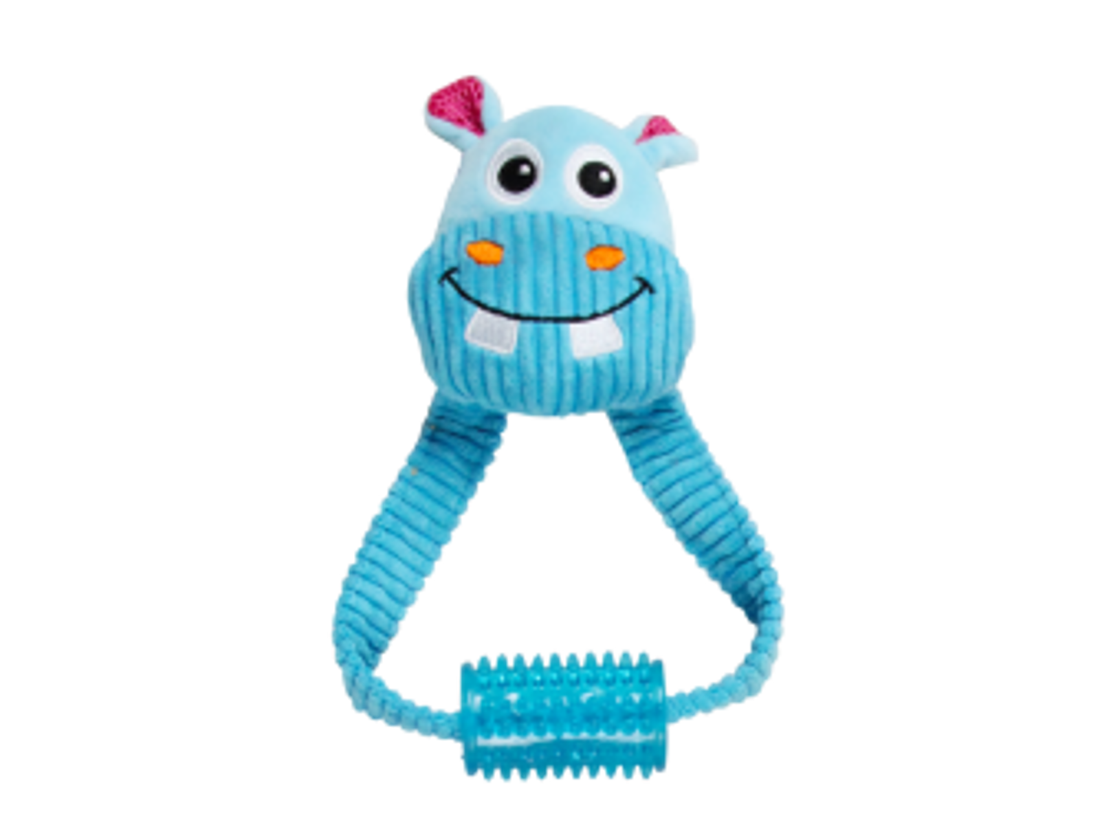 Tøjdyr formet som en Flodhest i hovedet, og med en gummi biderulle i bunden af den, således hunden vil kunne bide godt til, imens du holder den i modsatte ende.