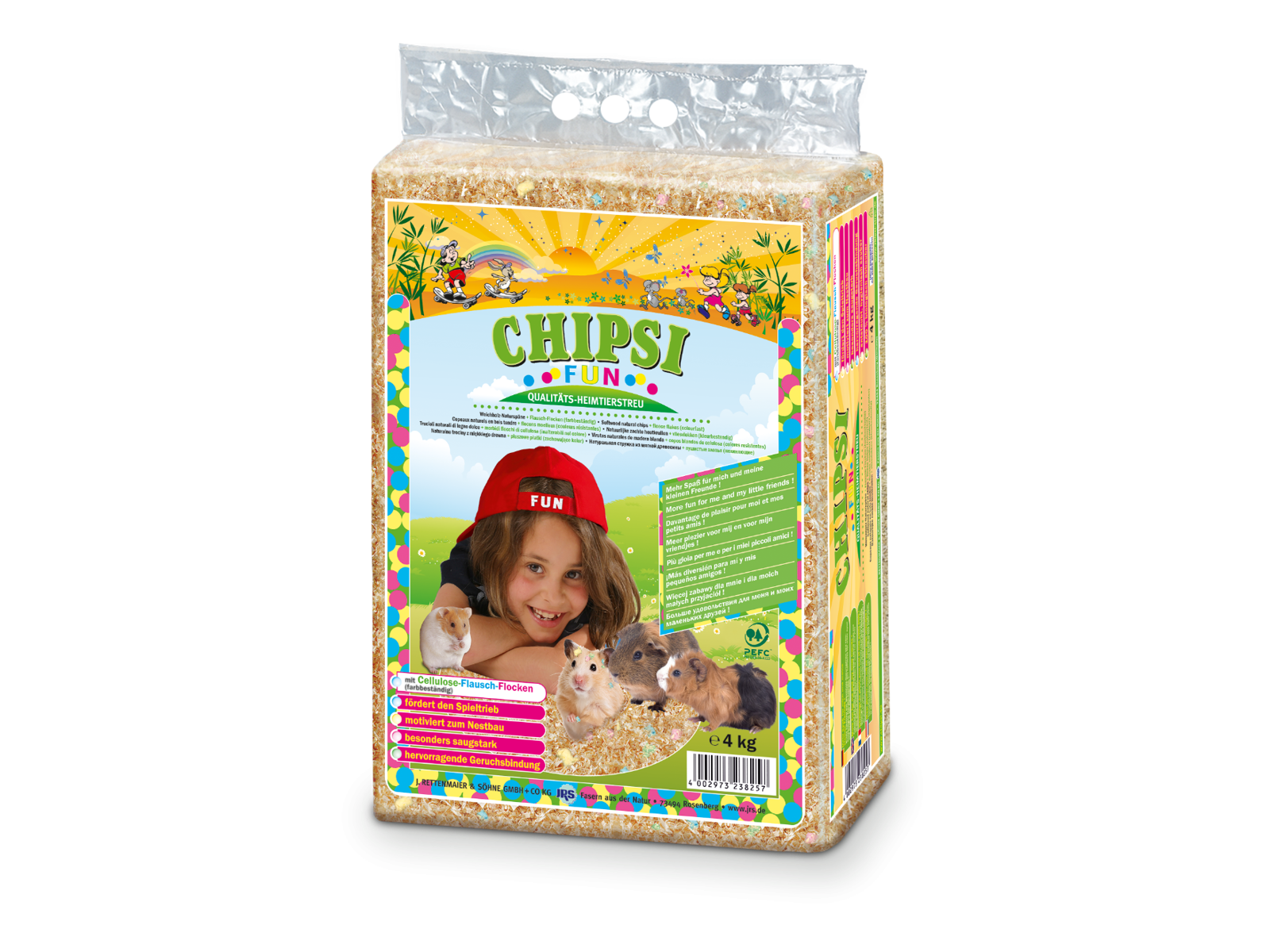 CHIPSI FUN farvet spåner er kendetegnet ved sit høje absorberingsevne og fremragende lugtbinding; det sikrer hygiejnisk renlighed; er støvfri og biologisk nedbrydeligt.