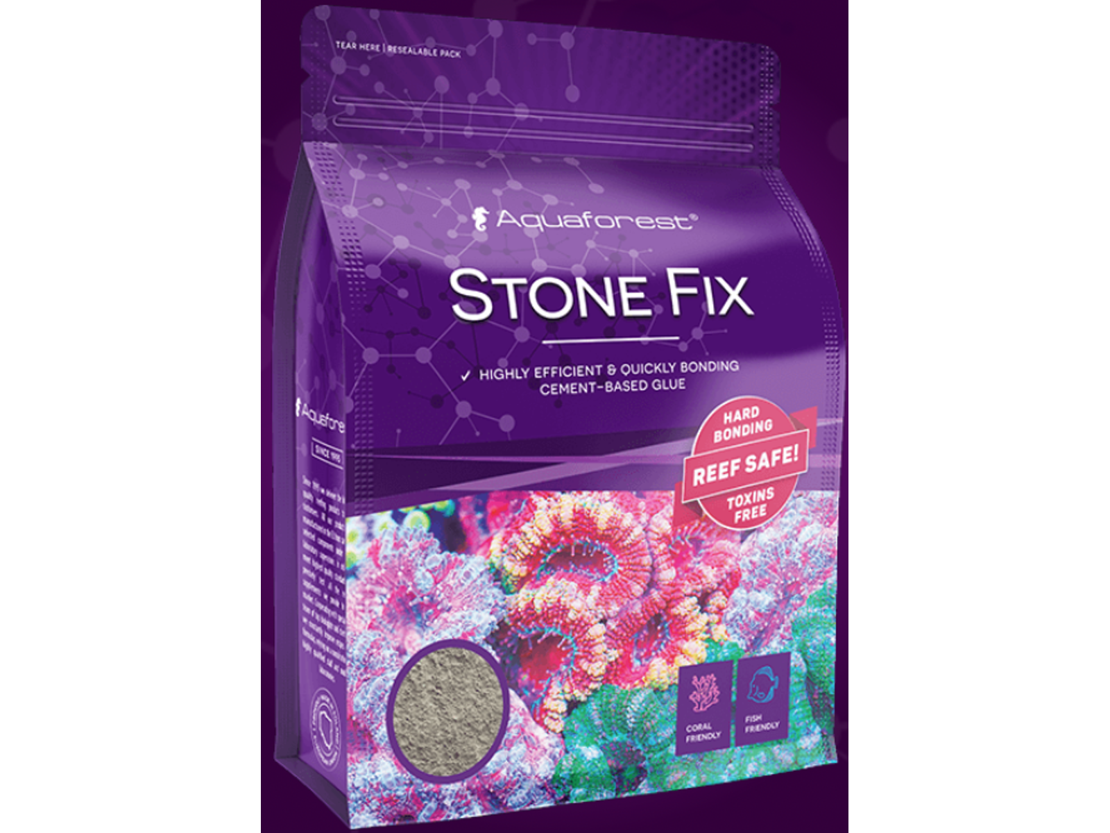 Hurtigt limende, cementbaseret lim designet til at forbinde store elementer af levende eller keramisk sten. Det indeholder ikke giftige forbindelser, hvilket gør det helt sikkert for fisk og hvirvelløse dyr. Sådan bruges: Bland en lille mængde lim med vand, indtil konsistensen bliver homogen. Begynd straks at klæbe elementerne. Stone Fix anbefales at blive brugt uden for tanken. Hvis det er nødvendigt at bruge undervands, skal alle cirkulations- og shuntpumper slukkes. Efter sammenkædning af de enkelte stykker, lad dem lime i 15 minutter. Midlertidig uklarhed af vandet er ikke skadeligt. På grund af mulig pH-stigning anbefaler vi i tanke med husdyr ikke at lime mere end 2-3 stykker om dagen. Indeholder: Portland cement. Opbevares på et køligt, tørt sted i den originale emballage i en periode på 12mc fra produktionsdatoen vist på etiketten.