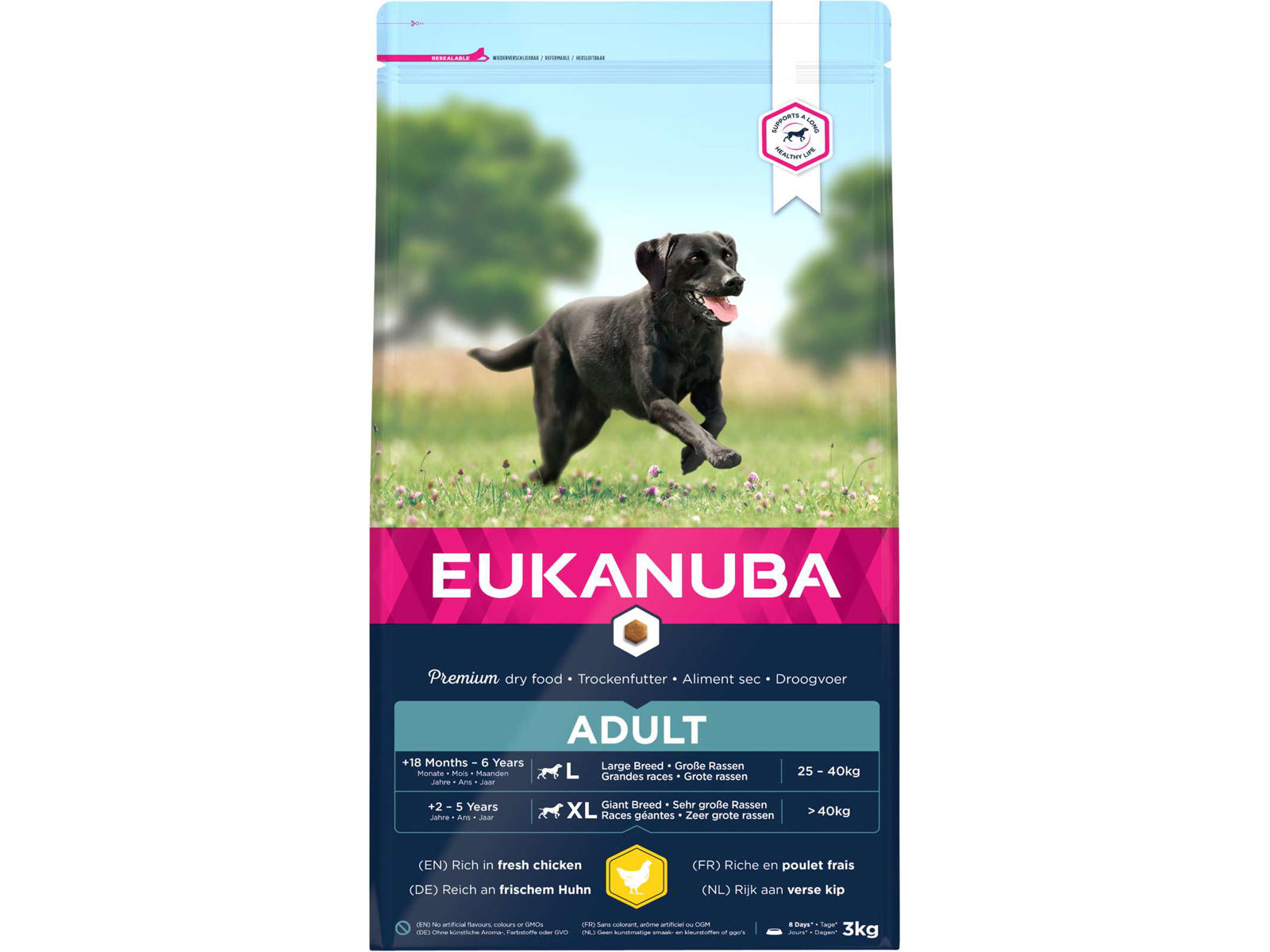 Eukanuba tørfoder i kibble-form indeholder meget frisk kylling og er perfekt til store voksne hunde i alderen 18 måneder til 6 år (eller 2 til 5 år for meget store hunderacer).