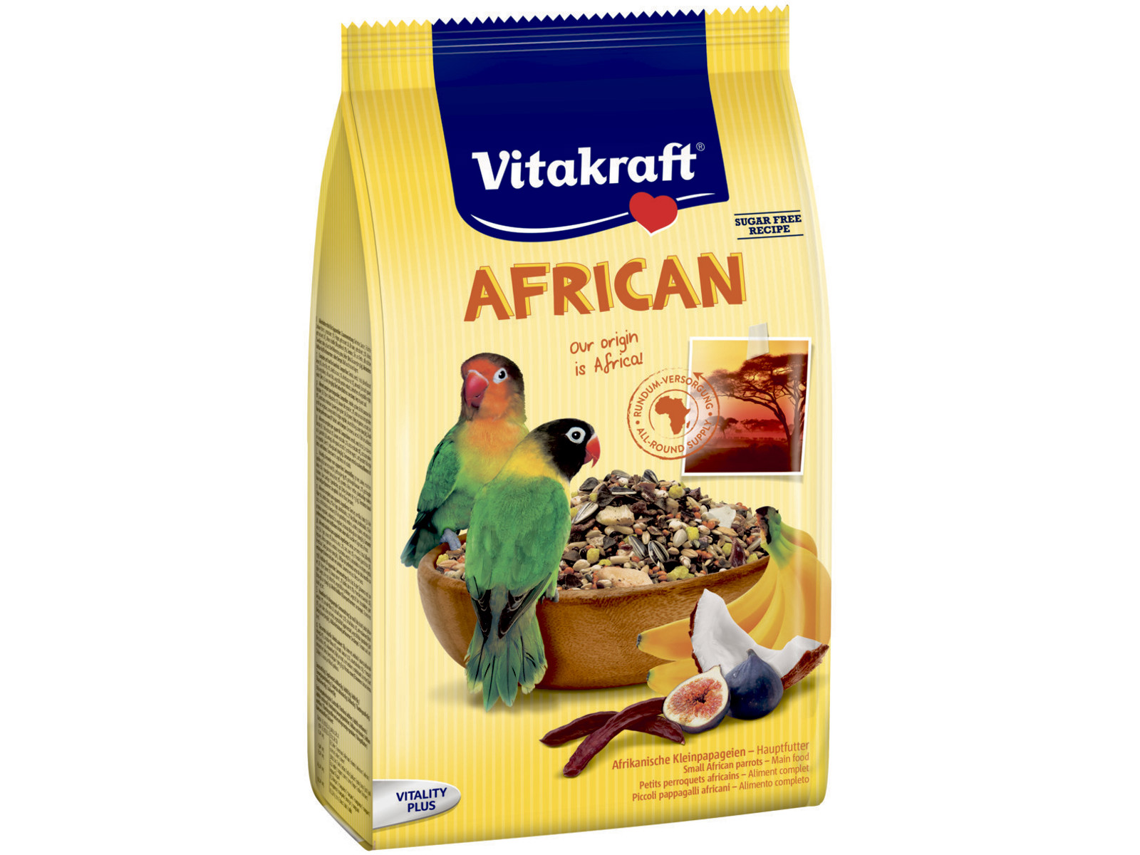 Vitakraft African er et foder, der er baseret på ingredienser fra de små afrikanske papegøjers oprindelige hjemstavn. Foderet indeholder derfor lækkerier som banan, kokos og figen, der er sammensat med omsorg og kærlighed og som hjælper din papegøje med at få dækket alle sine næringsbehov.