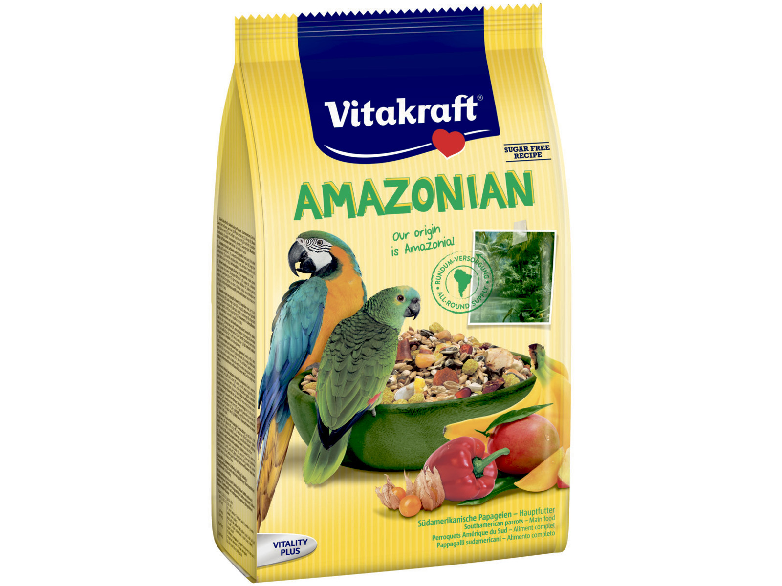 Vitakraft Amazonian er et afvekslende forkælelsesfoder til sydamerikanske papegøjer. Foderet er kærligt sammensat, så det giver papegøjen de vigtigste opbygnings- og næringsstoffer, som en papegøje har brug for, så den kan få et langt og sundt liv. Vitakraft Amazonian er blandt andet tilsat værdifuld mavekisel samt β-glucaner, som er kostfibre, der er gode for papegøjens mave. Vitakraft Amazonian indeholder ikke kunstige smagsstoffer og er ikke tilsat sukker.