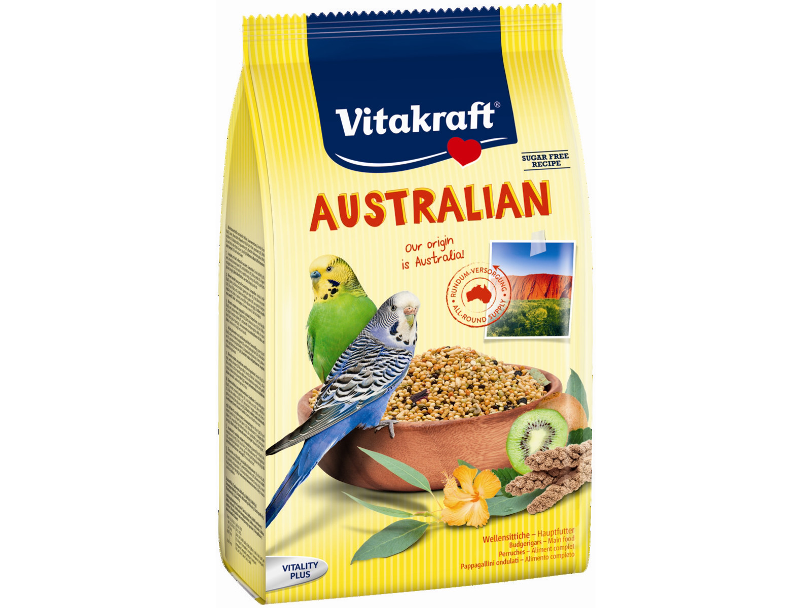Vitakraft Australian er et foder, der er sammensat helt særligt til de eksotiske australske undulater. Foderet er derfor artstilpasset og indeholder en masse naturlige delikatesser fra fuglenes hjemegn i Australien. Det drejer sig blandt andet om eukalyptus, hibiskusblomst og kiwi, der vil få undulaten til at synge af glæde og foderet er fremstillet med kærlighed og omsorg.