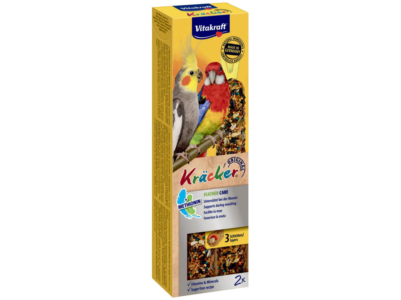 Vitakraft Kräcker Fjerpleje er dejlige fuglesnacks, der både beskæftiger parakitterne og hjælper dem med at pleje fjerene. Men de får også hjælp til at holde helbredet i topform. Indholdet af vitale vitaminer er højt og sammen med mineralerne i stængerne hjælper de dine parakitter med at holde sig sunde og raske og giver dem støtte til immunforsvaret. Vitakraft Kräcker Fjerpleje er desuden fremstillet uden sukker.