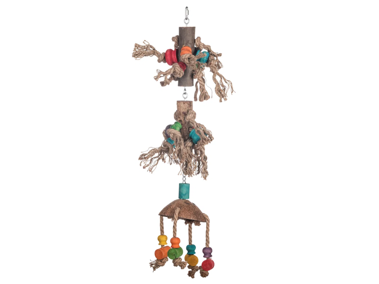 Coco Fantasy er ikke bare et legetøj, men en oplevelse. Din fugl kan klatre, gynge, gnave og udforske. Den kreative kombination af farverige træperler, kokosdele, sisaltov og naturlige materialer giver både fysisk og mental stimulering, hvilket forebygger kedsomhed og stress.