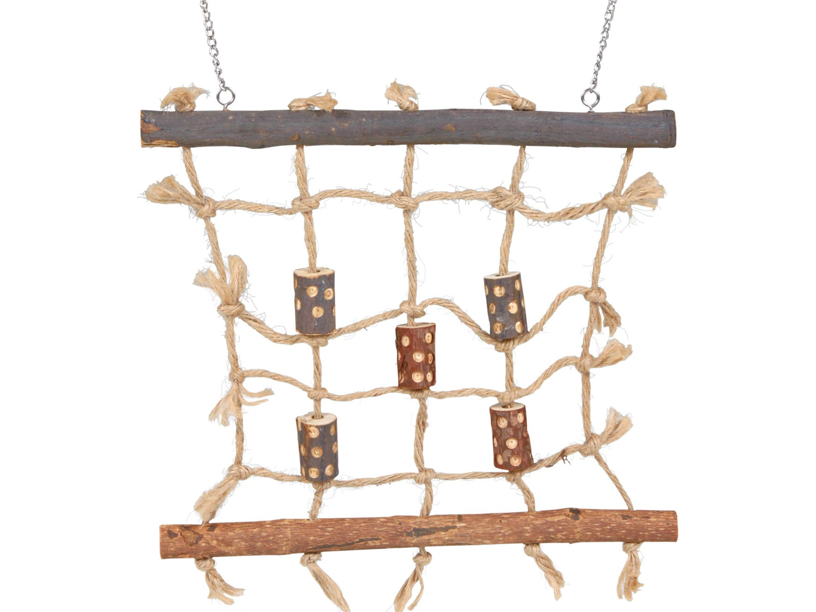Klatrenettet er fremstillet af robuste naturmaterialer og kan let monteres i buret ved hjælp af de medfølgende metalringe. Det giver din fugl en spændende aktivitet, der understøtter både motion og trivsel i hverdagen.