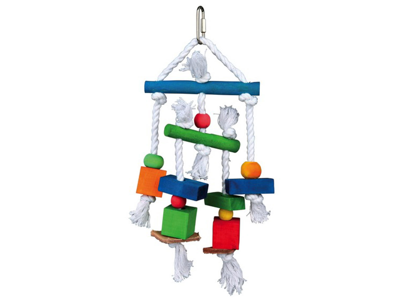 Trixie Trælegetøj med reb kan nemt fastgøres i burets tremmer eller på grenene, så din fugl rigtig kan være underholdt.