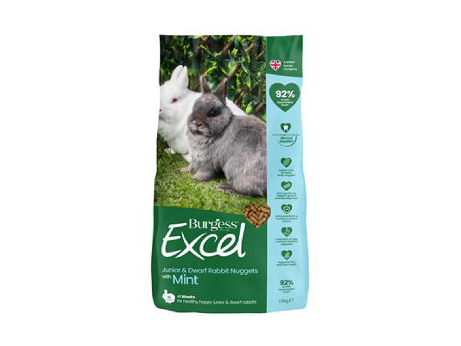 • Excel Junior og Dwarf Rabbit Nuggets med mynte er højere i protein og fiber og indeholder næringsstofferne til at understøtte voksende kaniner.
