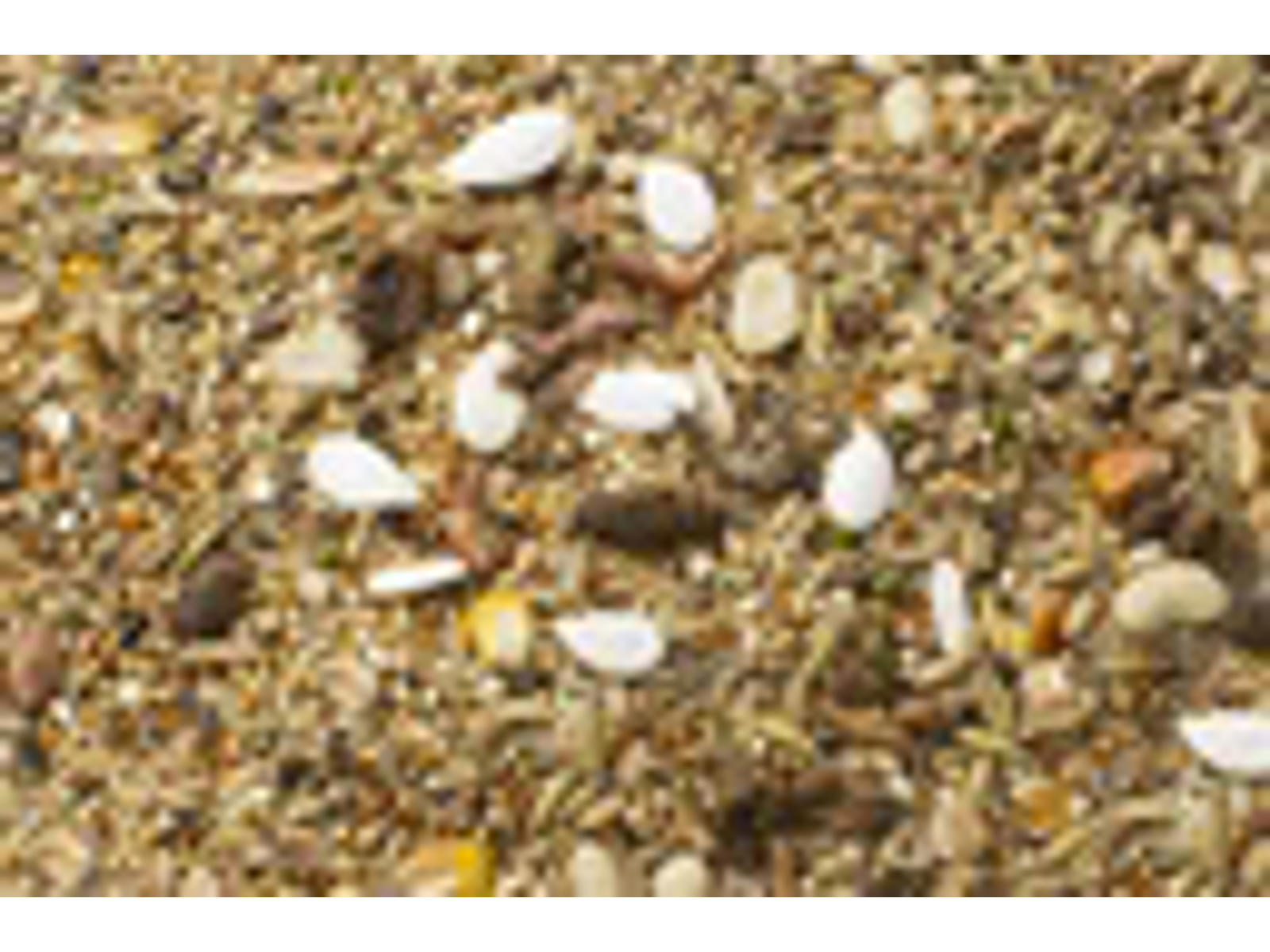 Ingredienser: Sølvhirse, gulhirse, mannahirse, havre, majs, hvede, jordnødder, hvedeflager, ris, kanariegræsfrø, puffet hvede, rød mohairhirse, boghvede, almindelig græsfrø, senegalhirse, rejer 3%, ukrudtsfrø, hørfrø, spelt, almindelig durra, silkeormpubber 2%, mungbønner, rød dari, hampfrø, marietidselfrø, græskarkerner, fennikelfrø, hybenfrø, sortkommen.
