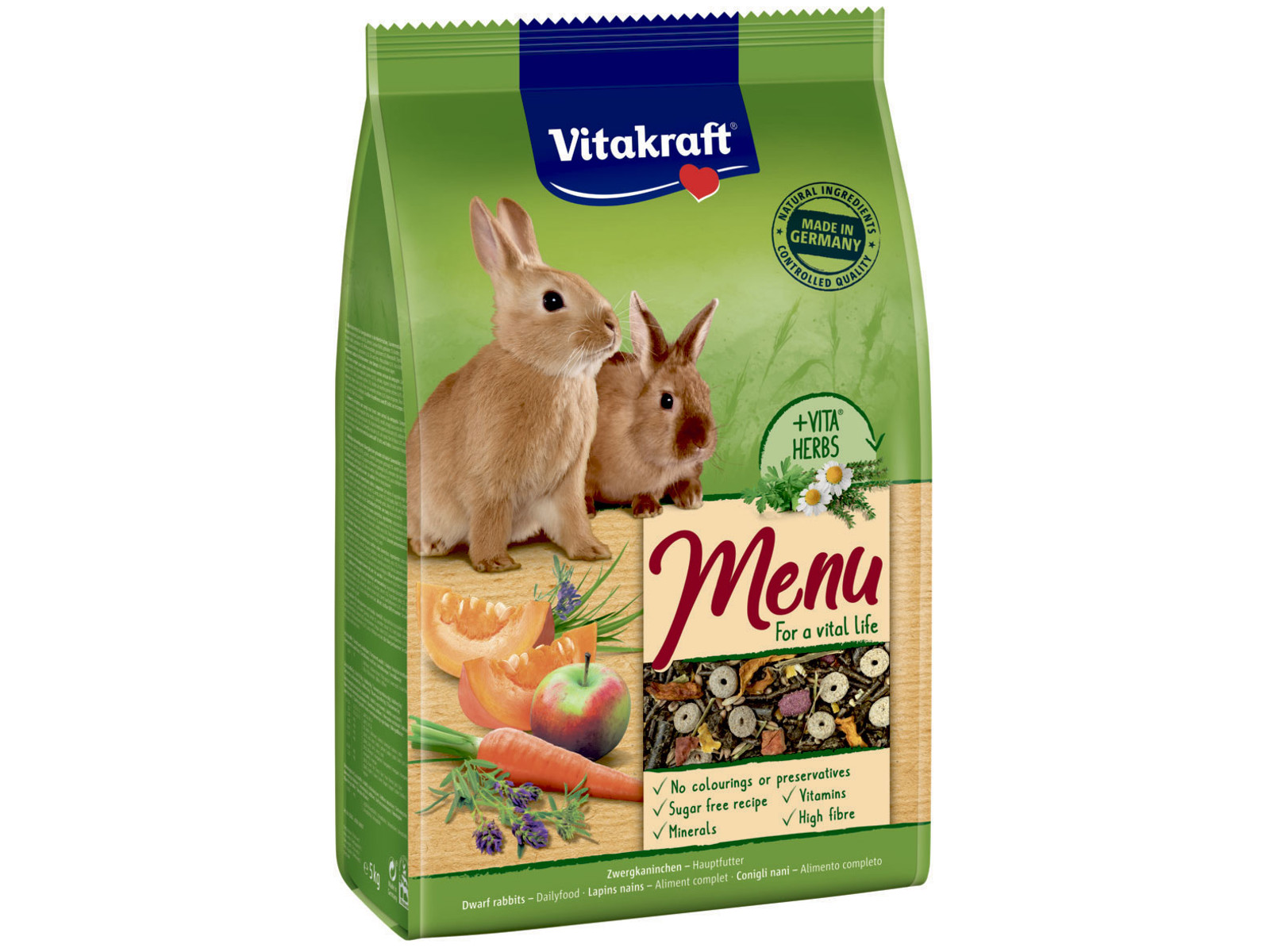 I Vitakrafts kaninfoder fra produktlinjen Menu Vita Herbs, finder du den unikke og patenterede VITA HERBS sammensætning. Vita Herbs bliver tilsat med stor omtanke for dværgkaniners behov for kost og ernæring, da de nærende urter hjælper til din dværgkanins velbefindende. Det er blandt andet timian og pebermynte samt hibiskus- og kamilleblomster der udvælges omhyggeligt.
