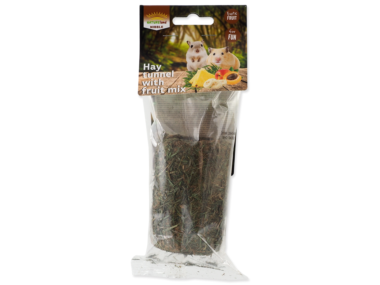 Tilskudsfoder til kaniner og gnavere. En høtunnel fyldt med en frugtblanding er en godbid og et legetøj på samme tid for kæledyret. Formel rig på fibre gavner også ved at file tænderne og har en positiv effekt på fordøjelsen. Anbefalet fodervejledning: Server som supplement til fuldfoderet. Dyret skal til enhver tid have uhindret adgang til frisk drikkevand. Opbevares på et køligt, tørt sted, beskyttet mod direkte sollys. Foder ikke fugtig, fugtig eller på anden måde svækket mad! Ikke beregnet til konsum.