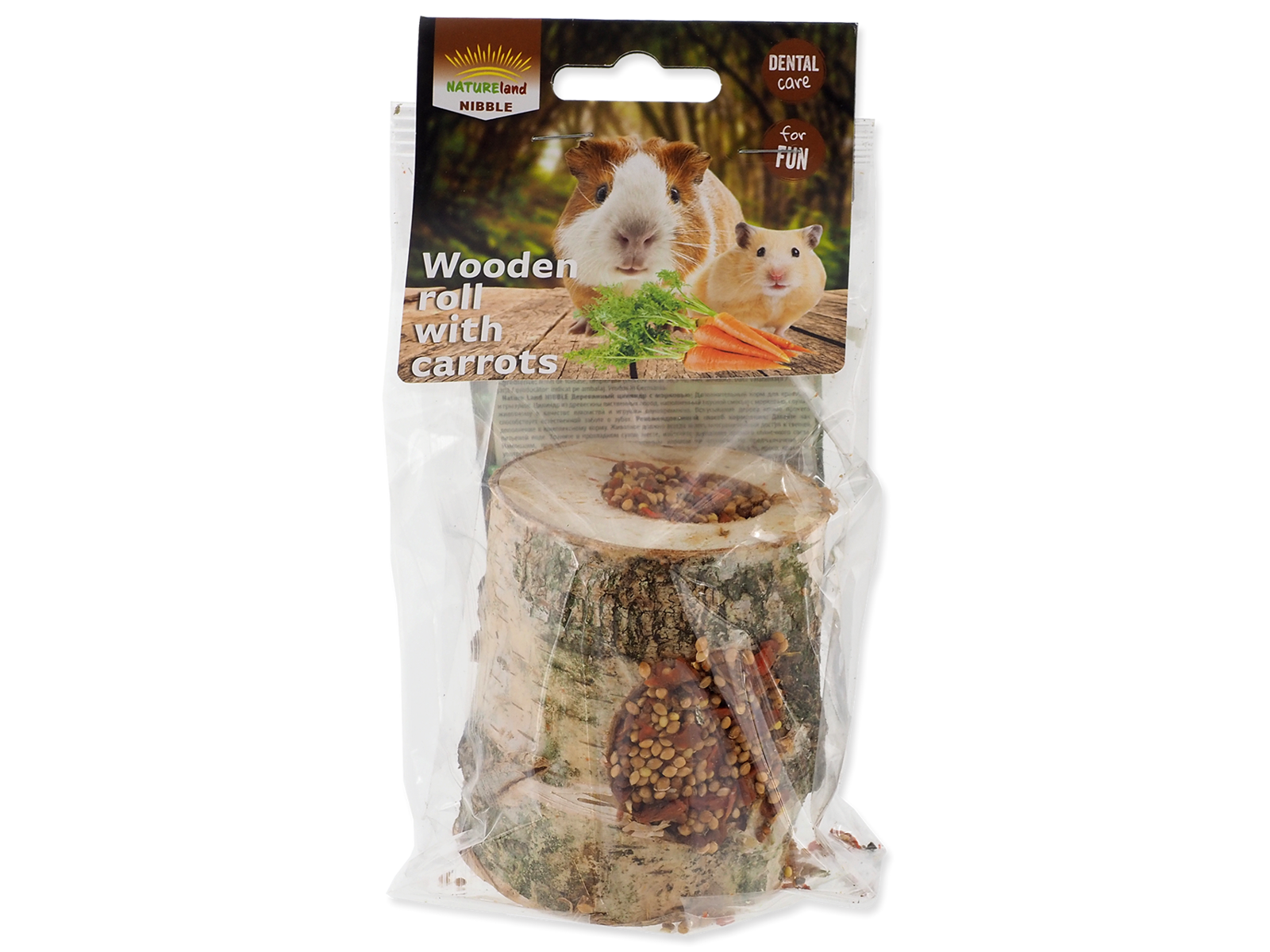 Tilskudsfoder til kaniner og gnavere. En cylinder af hårdttræ, som er fyldt med en lækker blanding af gulerødder, er både lækkert og legetøj på samme tid for kæledyret. At bide træ hjælper naturlig tandpleje. Anbefalet fodervejledning: Server som supplement til fuldfoderet. Dyret skal til enhver tid have uhindret adgang til frisk drikkevand. Opbevares på et køligt, tørt sted, beskyttet mod direkte sollys. Foder ikke fugtig, fugtig eller på anden måde svækket mad! Ikke beregnet til konsum.