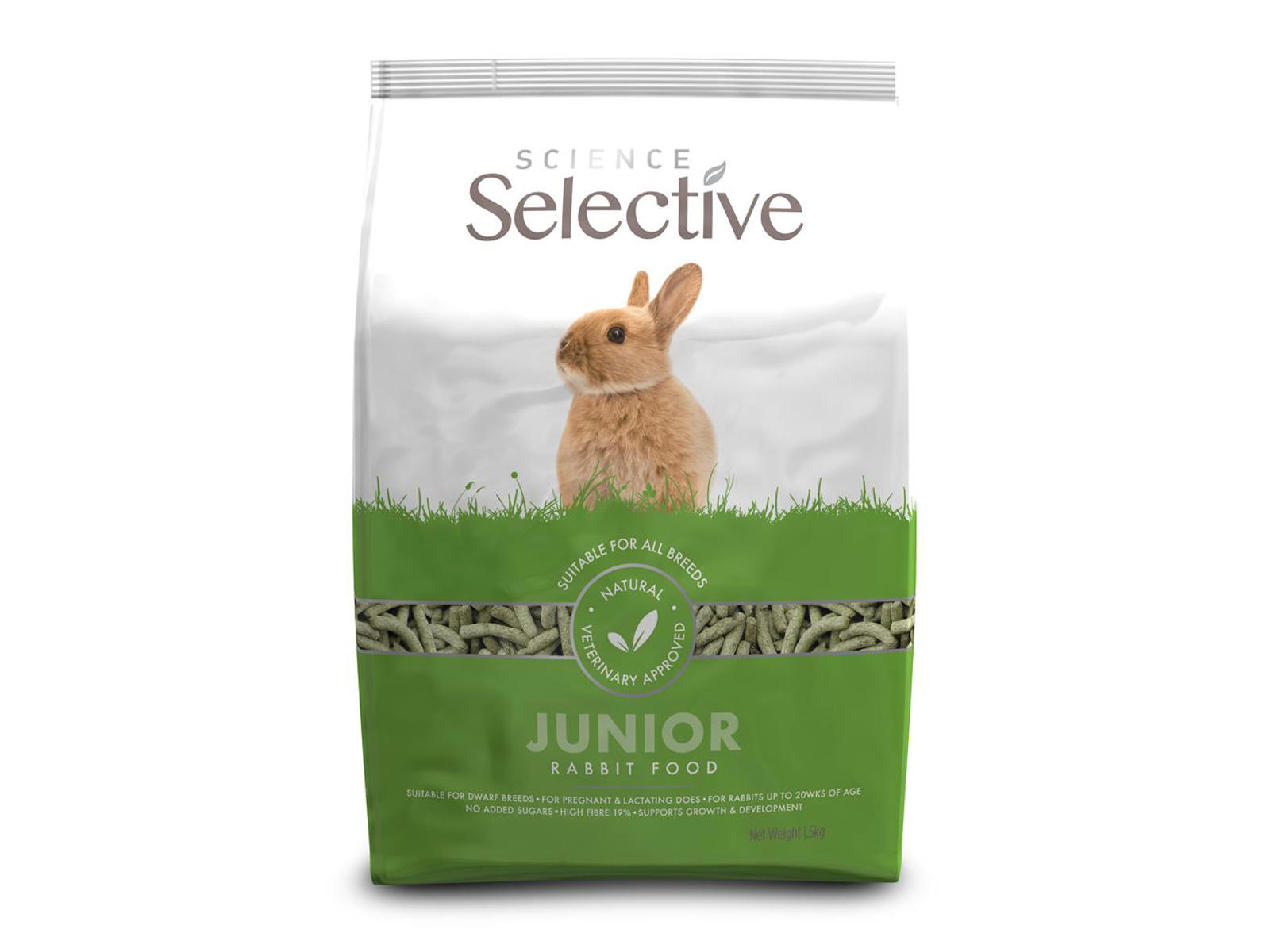Med et højt proteinindhold (17 %) og en afbalanceret mængde calcium og fosfor fremmer Science Selective Junior korrekt knogleudvikling og muskelopbygning. Foderet indeholder lucerne (alfaalfa) som naturlig kilde til fibre og protein, hvilket sikrer god fordøjelse og en smag, som unge kaniner elsker.