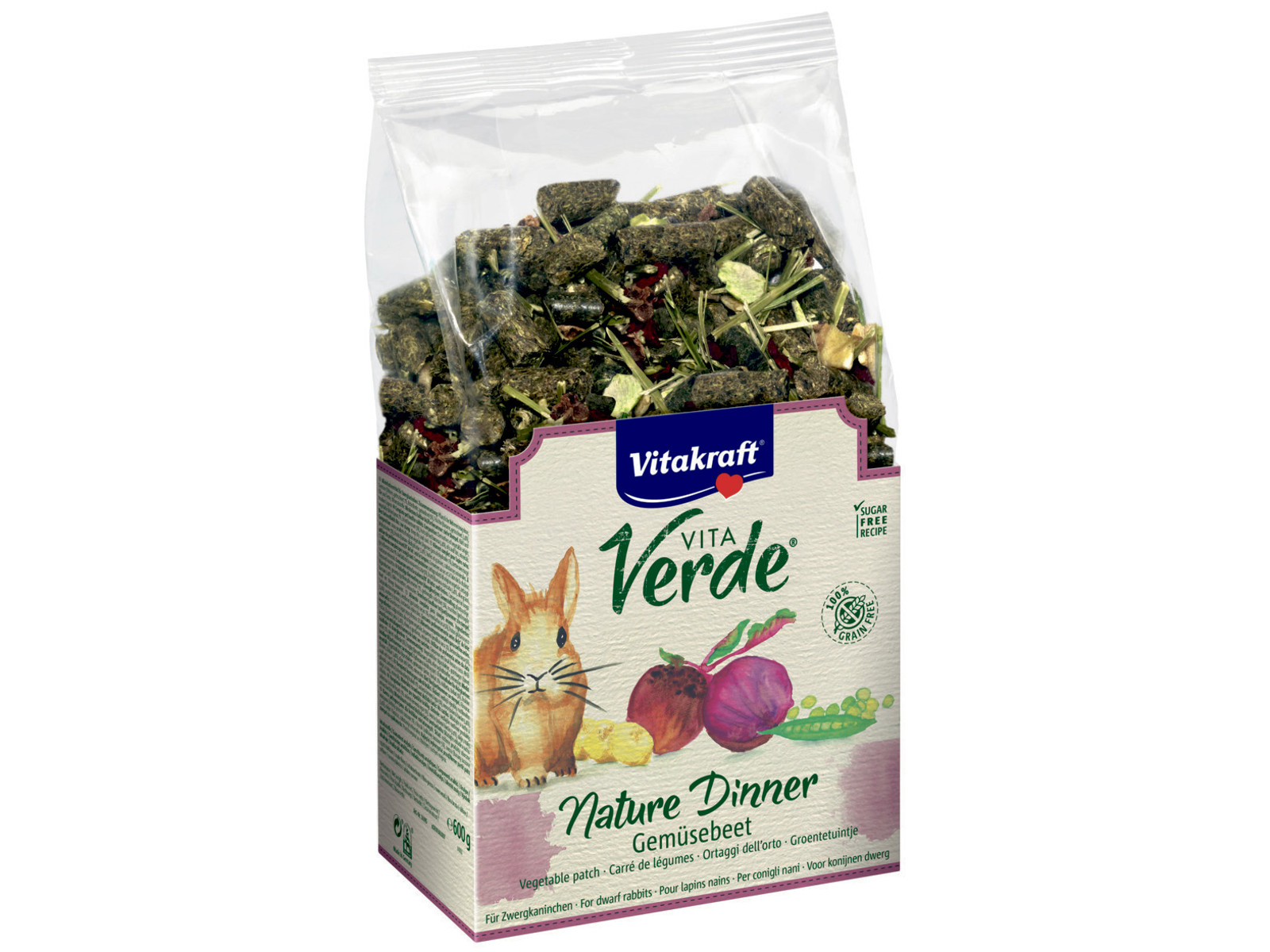 • Vitakraft Vita Verde Nature Dinner er et fuldfoder til en dværgkanin. Det er sammensat helt uden korn, hvor foderet i stedet bliver spækket med sprøde rødbeder og lækre ærter, som derefter er smagt til med banan for en naturlig sødme.