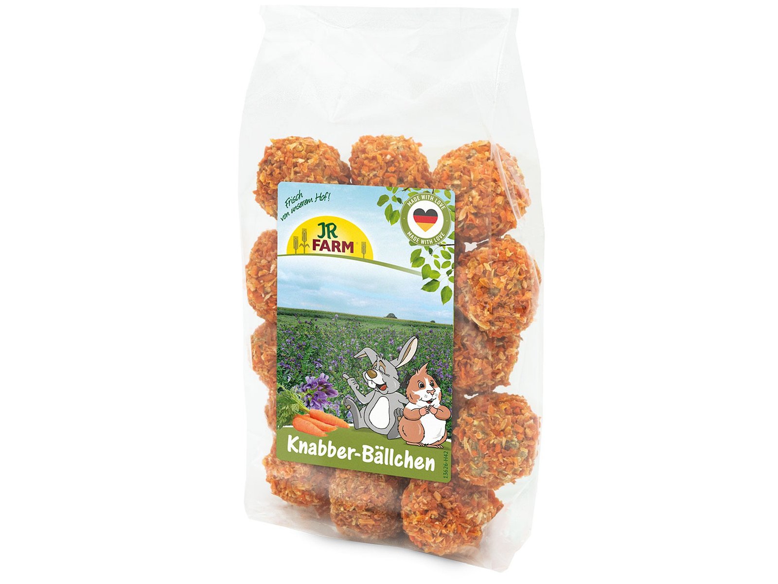 JR Farm Gnaskebolde er en velsmagende og funktionel snack til gnavere og dværgkaniner, der kombinerer ernæring, aktivering og tandpleje i ét produkt. De hårdt pressede bolde er fremstillet af naturlige ingredienser som lucerne og gulerødder, hvilket giver både en god smag og et højt fiberindhold.