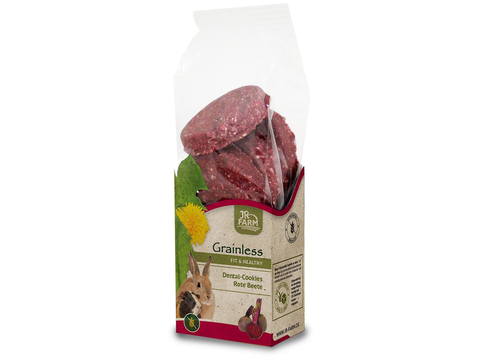 JR Grainless Health Dental – Rødbede er en kornfri og funktionel snack til kaniner og gnavere, udviklet med fokus på tandpleje og naturlig beskæftigelse. Den faste struktur og specielle form er designet til at understøtte den naturlige slid af tænderne, som er essentiel for små planteædere.