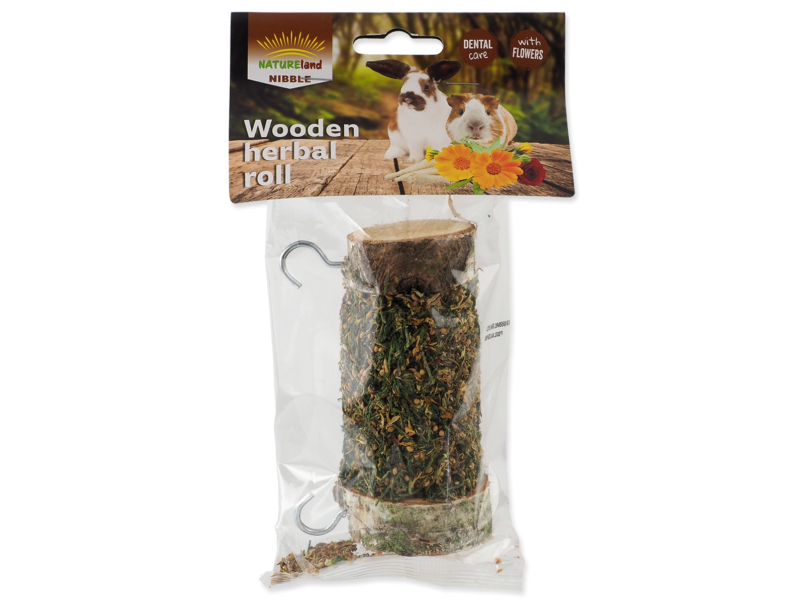 Tilskudsfoder til kaniner og gnavere. Hårdttræsrulle er fyldt med en lækker blanding af persille, rose og morgenfrue medicinske kronblade. Dit kæledyr vil nyde at nappe indholdet, mens bidende træ giver naturlig tandpleje. Anbefalet fodervejledning: Server som supplement til fuldfoderet. Dyret skal til enhver tid have uhindret adgang til frisk drikkevand. Opbevares på et køligt, tørt sted, beskyttet mod direkte sollys. Foder ikke fugtig, fugtig eller på anden måde svækket mad! Ikke beregnet til konsum.
