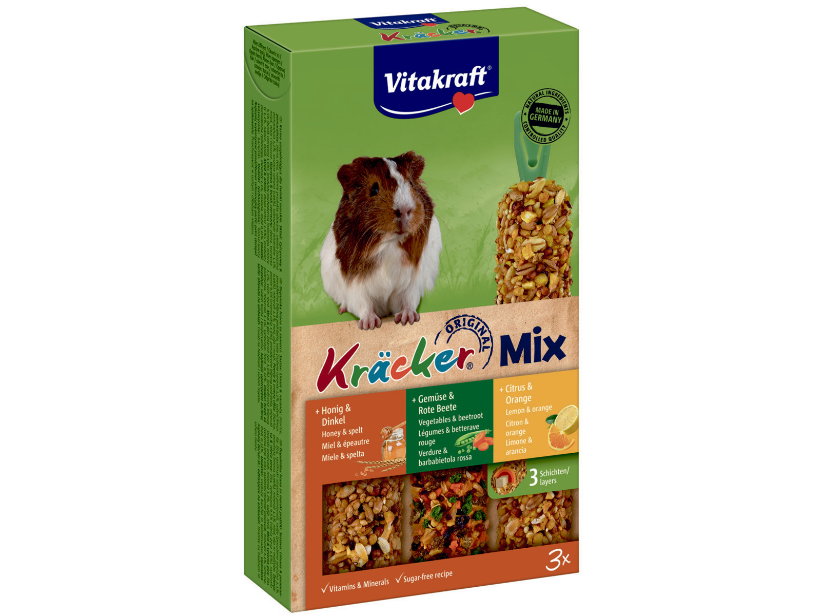 • Vitakraft Kräcker Mix er en pakke med tre dejlige godbidder, som dit marsvin vil elske at få serveret.