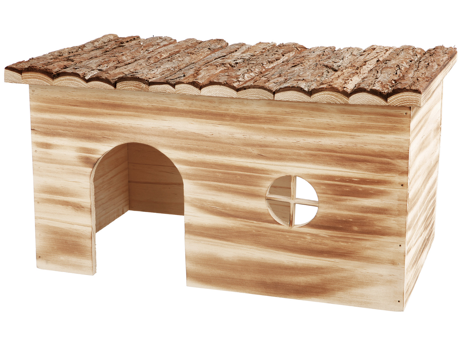 Flot kaninhus i "Flame-wood" med fint bjælke-tag af naturtræ med bark.