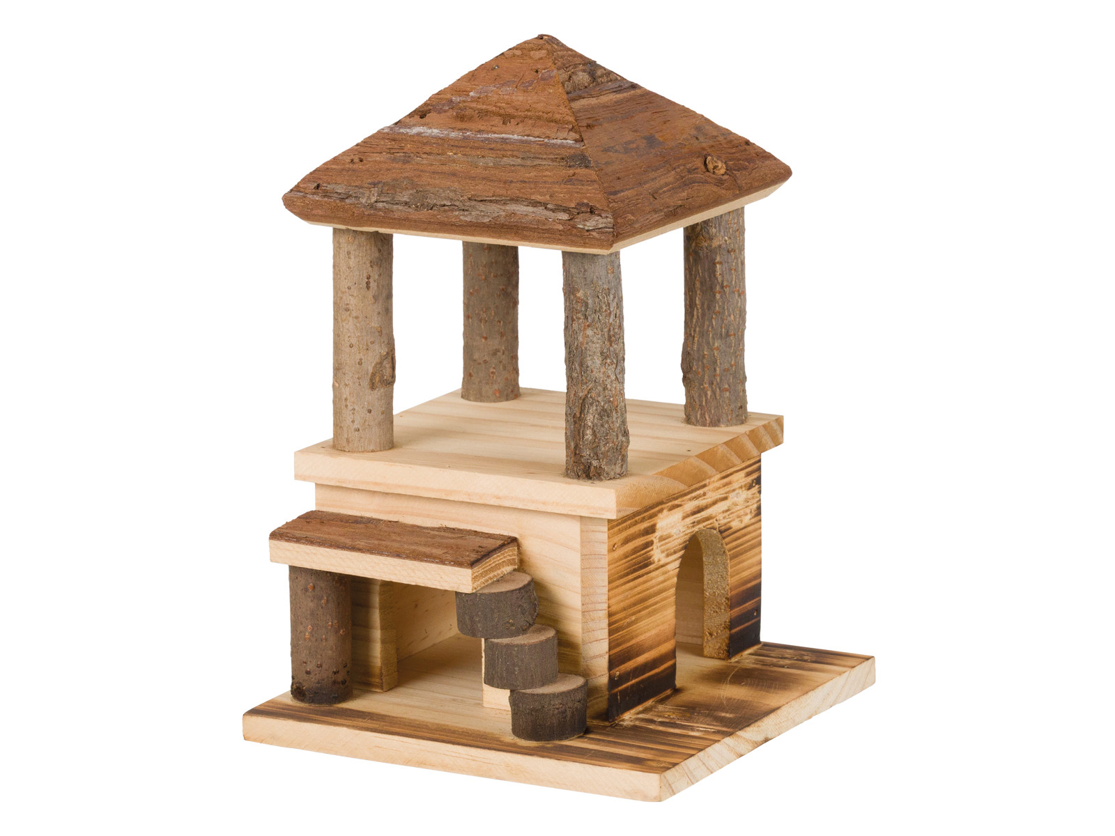 Huset er lavet i naturtræ, og der er en lille trappe på siden, så din gnaver kan bevæge sig til tops. Træet har brændt look og pynter i de flester hamsterbure.