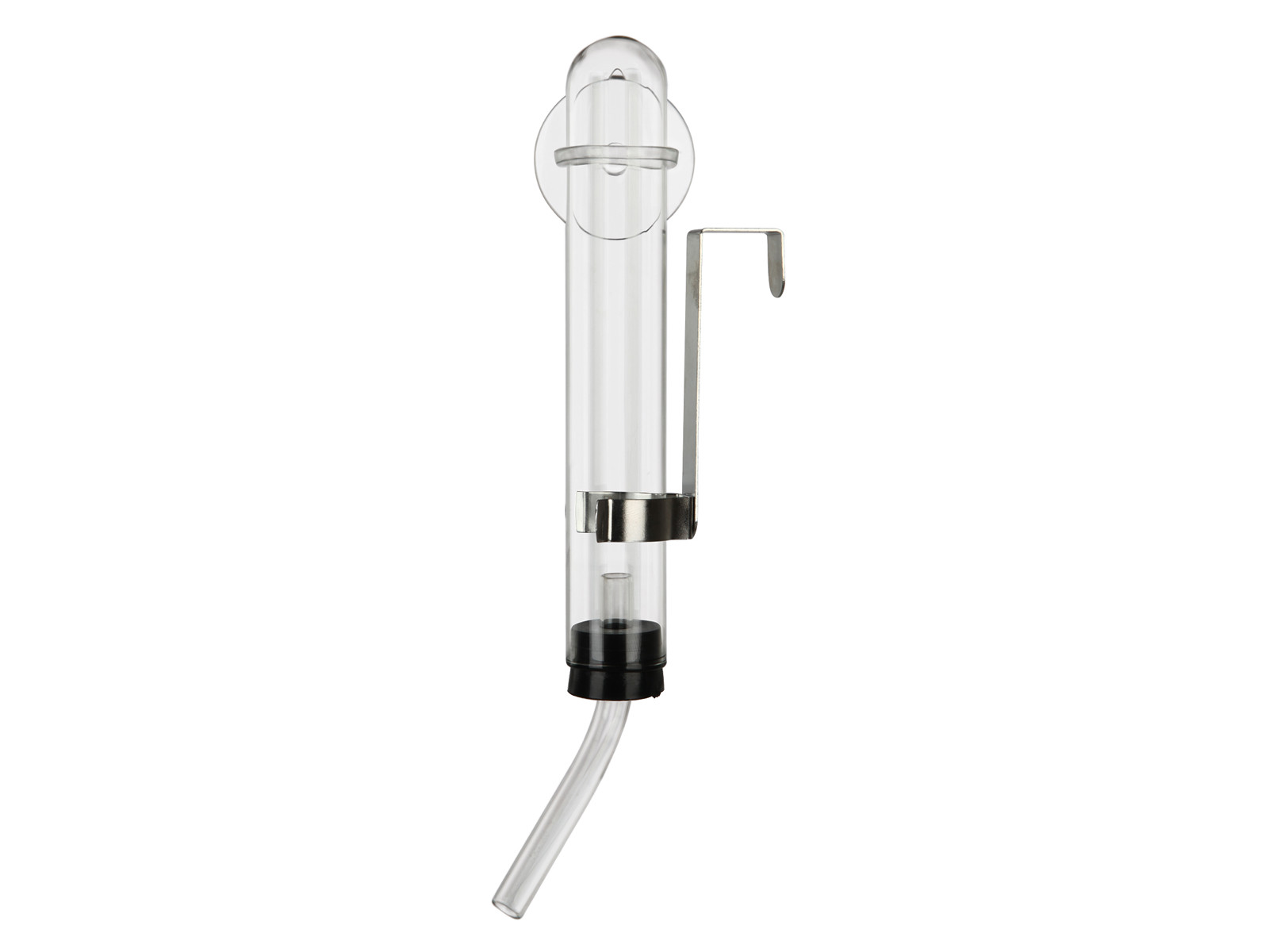 Drikkeflaske i glas. Medfølger sugekop, så flasken også kan sidde fast på glatteoverflader, som for eksempel bure med plastik sider.