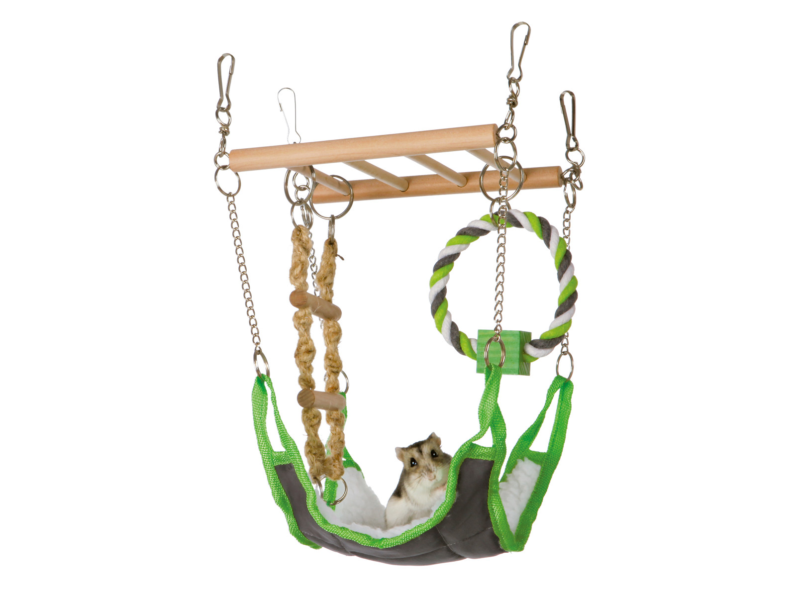 Hængebro med hængekøje.Træstige, med nylon hængekøje med lammeskindsimitation, rebstige og rebring med træklods.