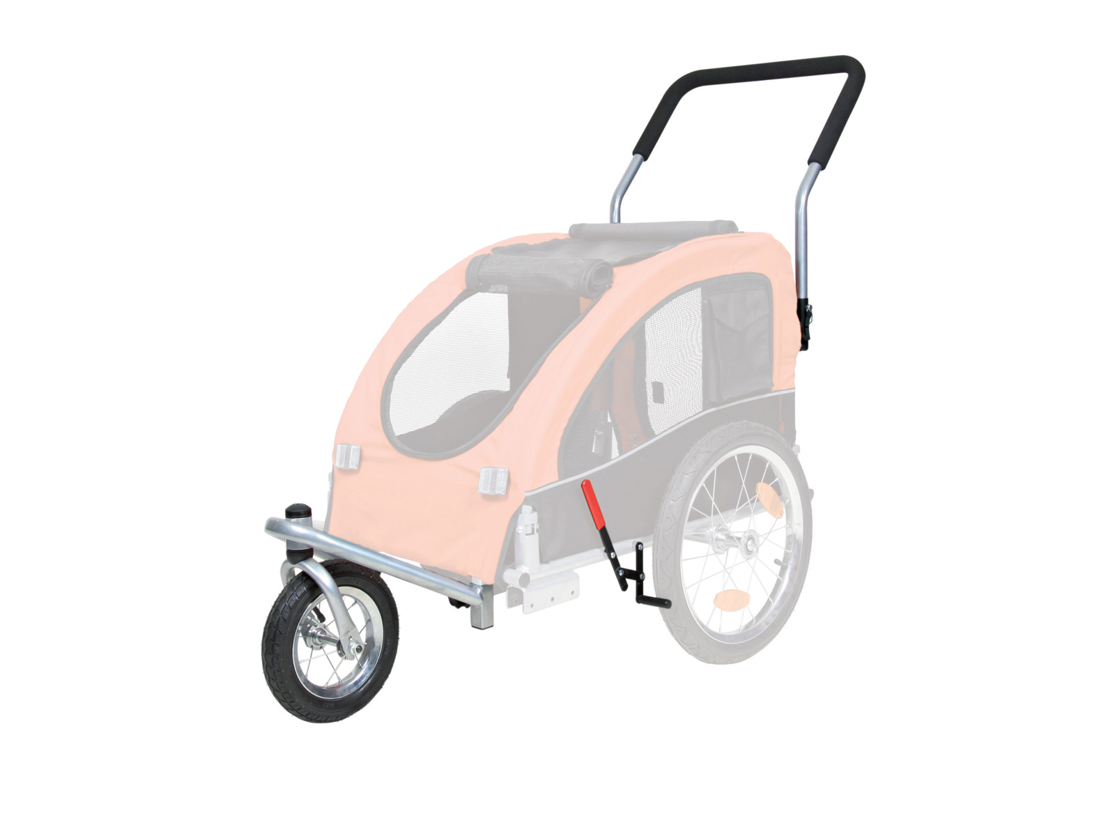 Ombygningskit til jogger. Der medfølger: forhjul, parkeringsbremse og non-slip-håndtag.