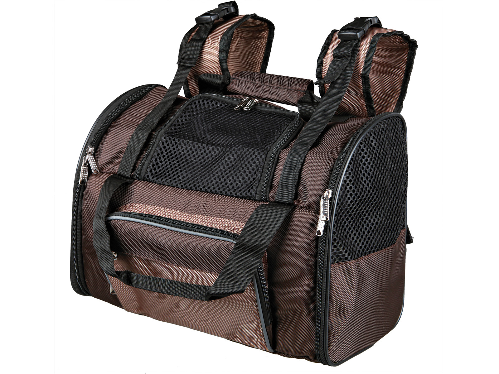 Yderst praktisk rygsæk og transporttaske i nylon af høj kvalitet. Tasken åbnes både foran og i toppen og de integrerede netindsatser sørger yderligere for en god lufttilførsel. Har to separate tasker foran og praktisk lomme til mobiltelefon.