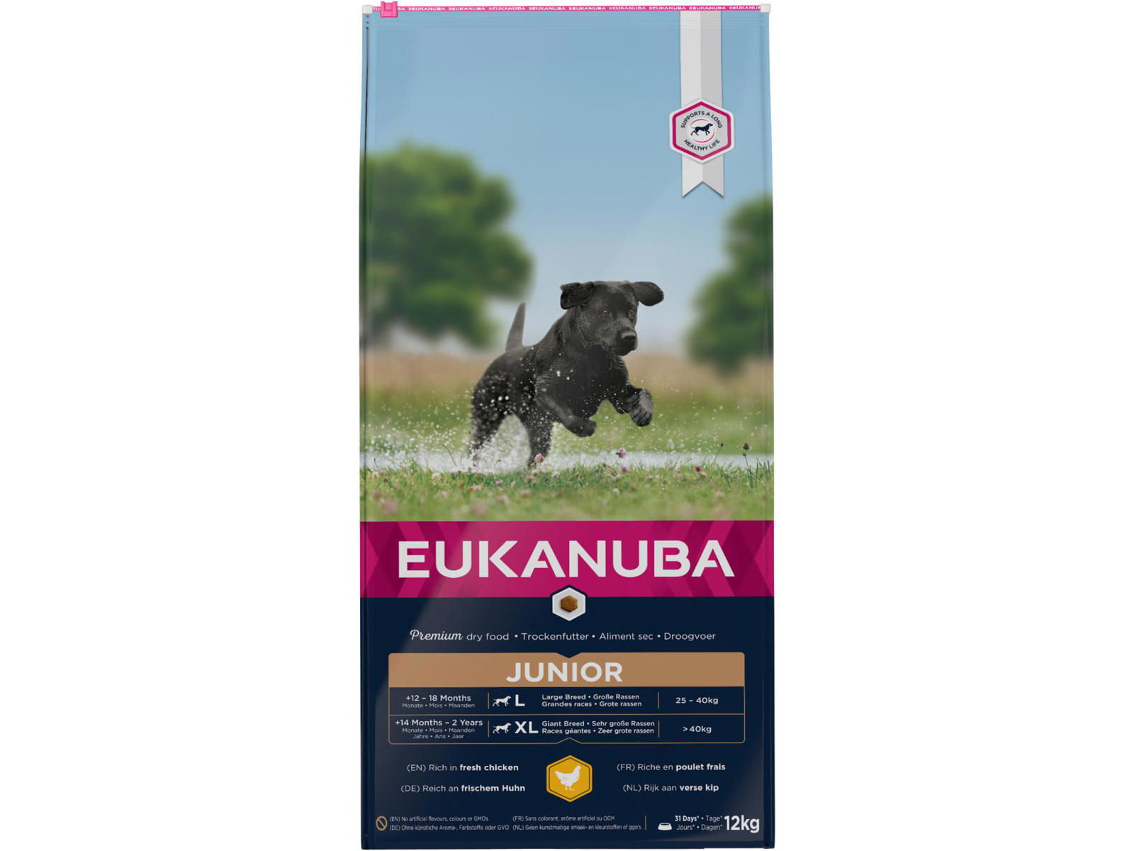• Eukanuba tørfoder er rig på fersk kylling og perfekt til unghunde af store racer i alderen 12 til 18 måneder (14 måneder til 2 år for kæmpe racer).