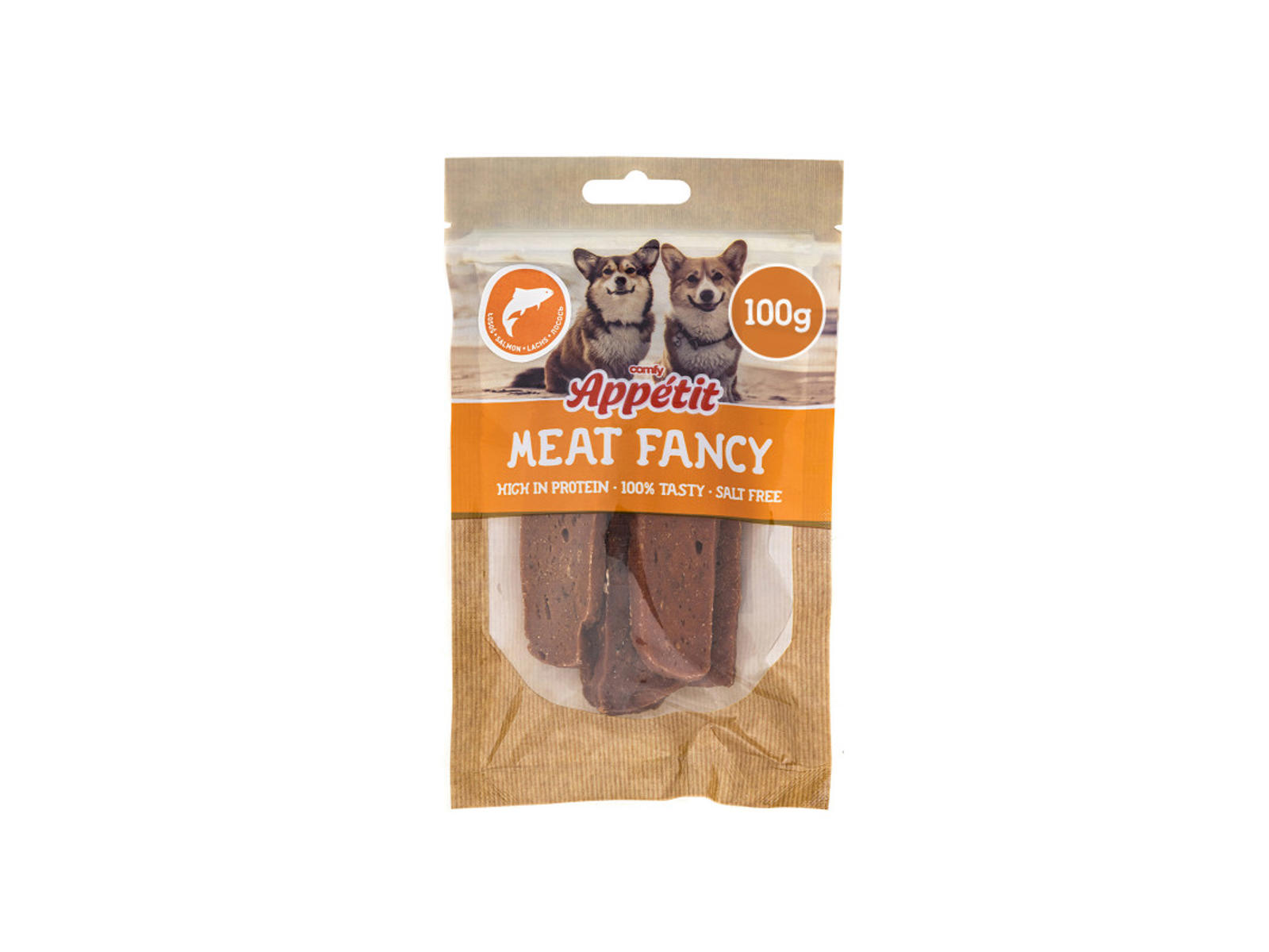 COMFY APPETIT FANCY SALMON er en hundegodbid med højt proteinindhold og lavt kalorieindhold tilberedt uden tilsat sukker, salt eller gluten. Indeholder op til 92% laks. Fantastisk som snacks under gåture eller som belønning, mens du træner dit kæledyr. Fås i praktiske og holdbare 100 g ziplock-poser. Universal, anbefales til hunde af alle racer og størrelser.