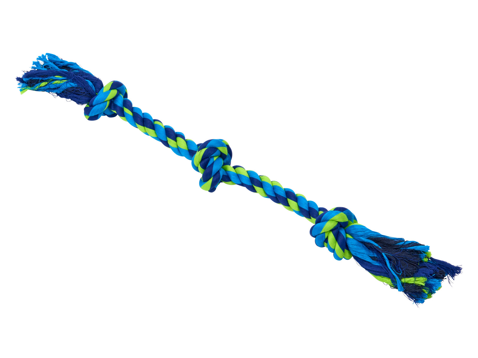 Dette legereb har tre knuder, så der er masser af hjørner at få fat i for din hund. Når din hund tygger i rebbet, bliver dens tænder og tandkød renset og på den måde hjælper du den til en bedre dentalhygiejne, ved at give den dette legetreb.