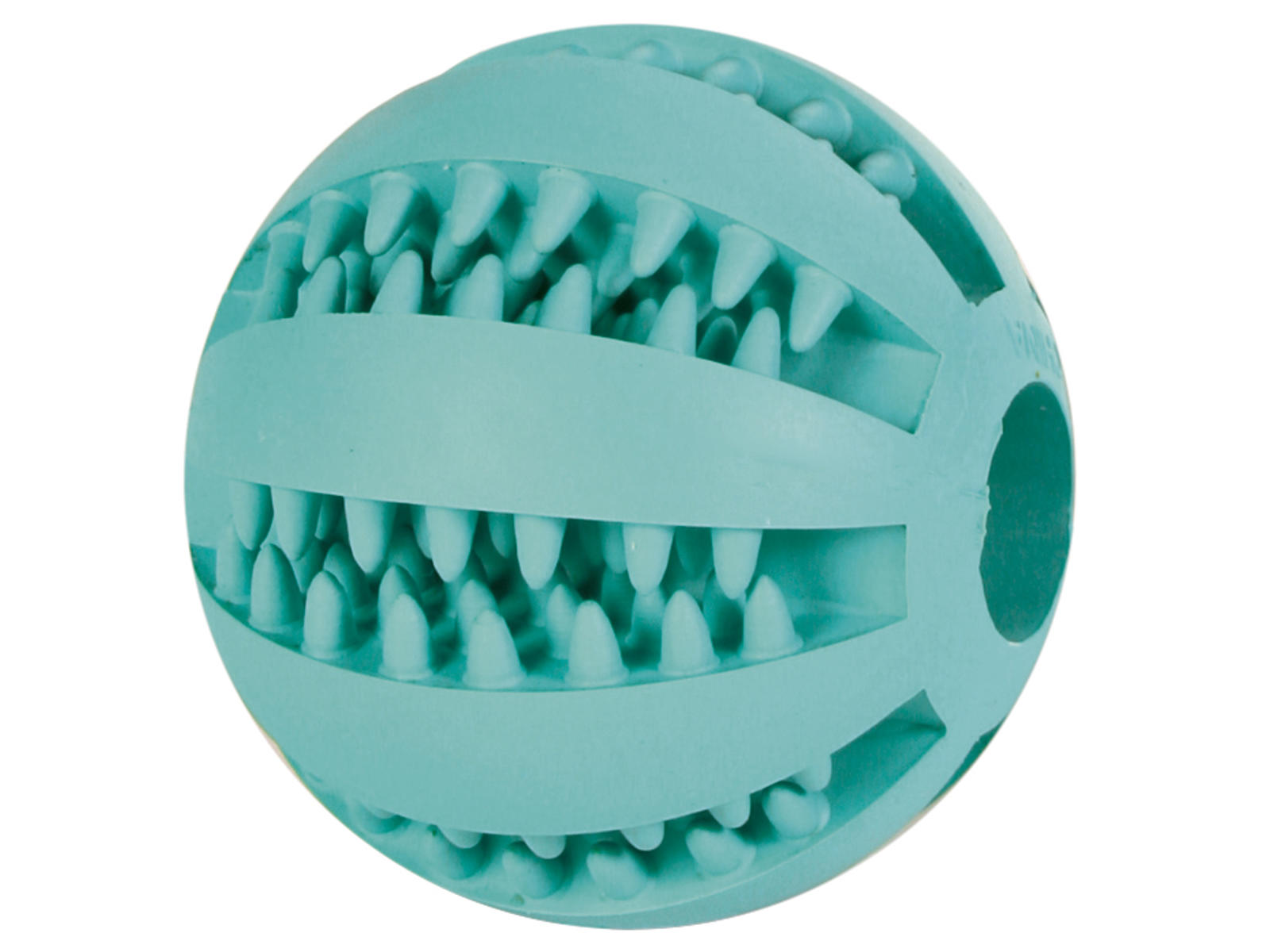Baseball fra Trixie er lavet i naturgummi, med lugt og smag af mint. Boldens overflade og tekstur har ribber, som blidt masserer og renser fin hunds tænder og gummer, når den ligger og gnaver i bolden. På denne måde renses tænderne for plak og urenheder.