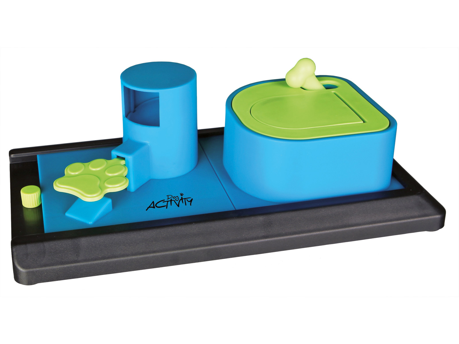 • Hunden får sin belønning ved at bruge forskellige teknikker for at åbne for tilgangen til godbidderne. F.eks. kan der lægges godbidder i røret til venstre på billedet - her skal hunden træde på den grønne pote for at åbne for slusen og dermed få sin godbid.