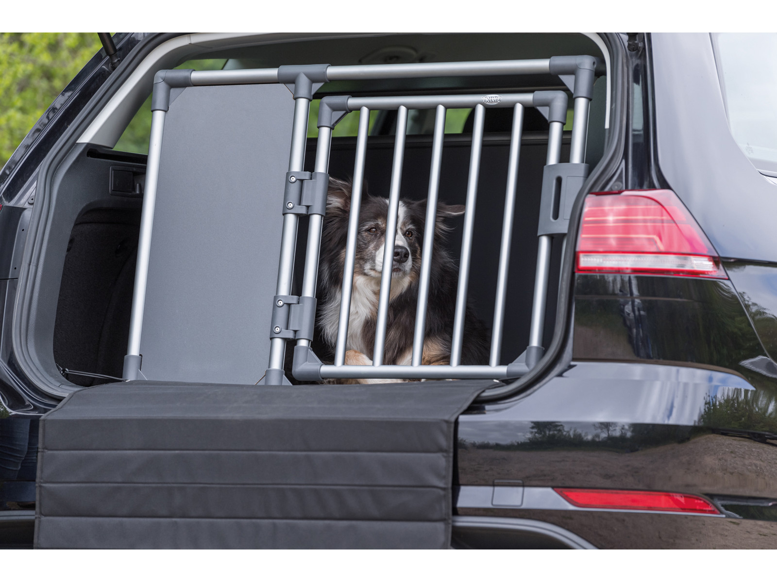 Perfekt til sikker transport af én stor eller to mellemstore hunde i bilens bagagerum. Passer til SUV’er, stationcars og varevogne.
