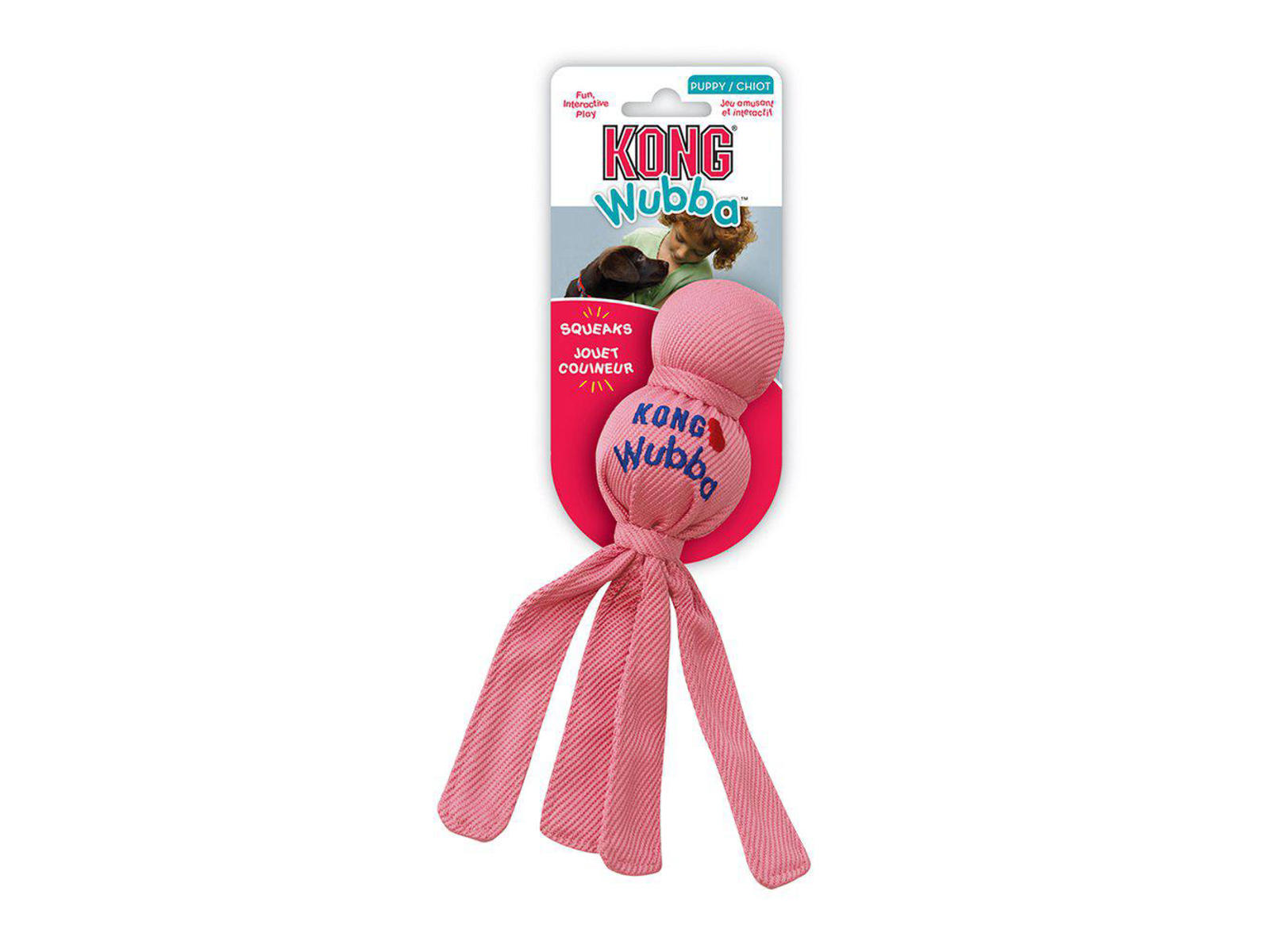 • KONG Puppy Wubba™ er et sjovt, interaktivt slæbe- og kastelegetøj, der er fantastisk til interaktiv eller solo leg. Dens lange floppy tails er ideelle til ryste- og trækinstinkter samt apporteringsspil. En holdbar forstærket nylon udvendig kombination med unikke boldformer til begyndende legesessioner, der varer længere. Hvalpe elsker at knirke med Puppy Wubba™ og øge det sjove ved at ryste de flagrende hale frem og tilbage, hvilket gør hvert spil anderledes end det næste.