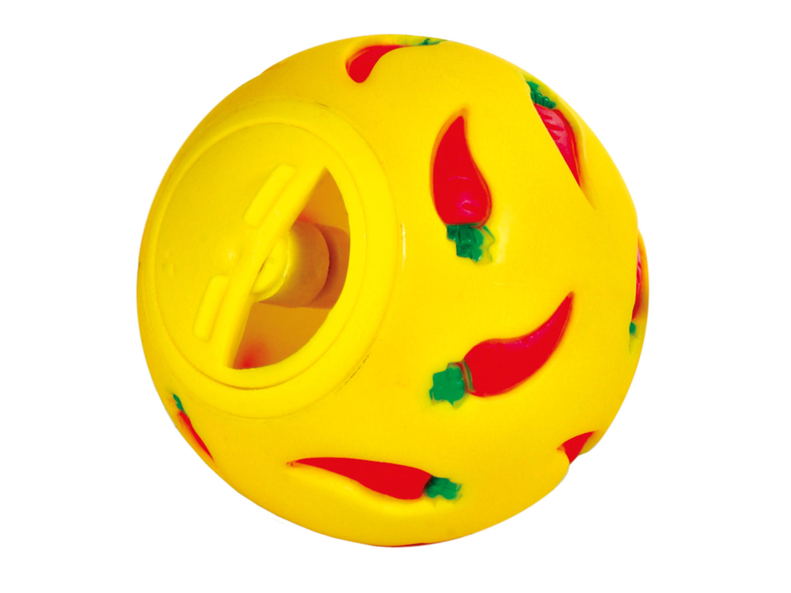 Snackbold i plast med justerbar hul så godbidderne kan fuld ud når bolden ruller.
