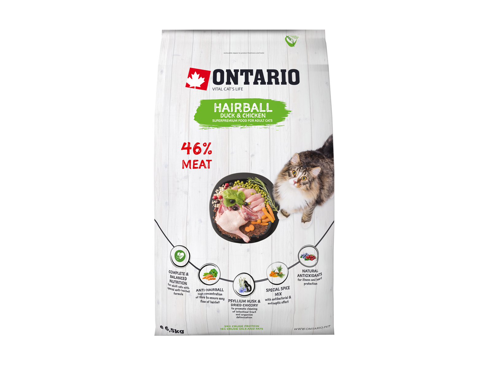 Vælg Ontario Cat Adult Hairball 6,5kg for at reducere dannelsen af hårboller og støtte en sund fordøjelse hos din voksne kat.