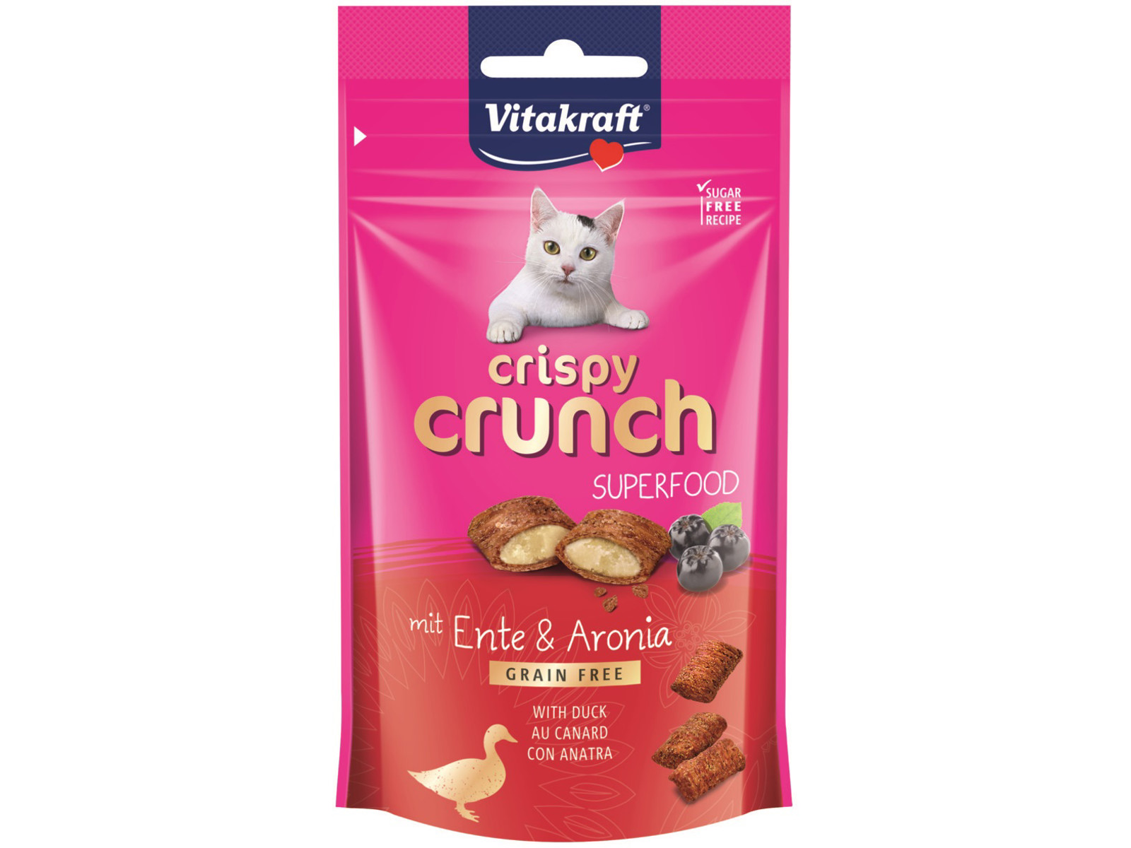 • Vitakraft Crispy Crunch Superfood kattegodbid med and og aronia er en knassprød godbid til din kat. De lækre og små kroketter i posen, er fremstillet med et sprødt ydre og et blødt indre med et kødfyld af and og aroniabær, der er anerkendt som et superfood.