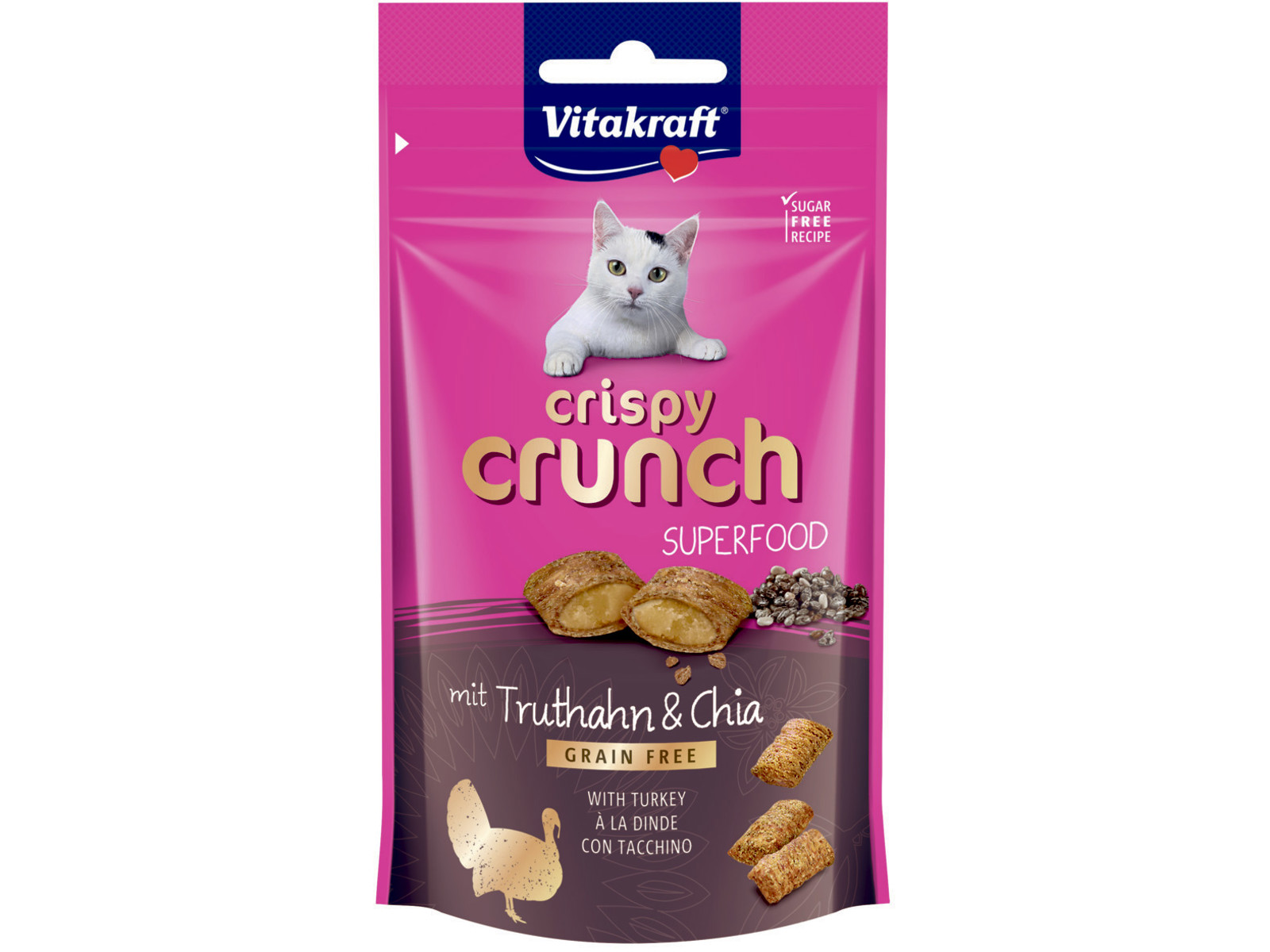 Vitakraft Crispy Crunch Superfood kattegodbid med kalkun og chia er en lækker og knassprød godbid til din kat. De små kroketter i posen er sprøde udenpå, men fremstilles med et lækkert og blødt fyld af kalkun og chiafrø indeni. Chiafrø er kendt i hele verden som et anerkendt superfood.