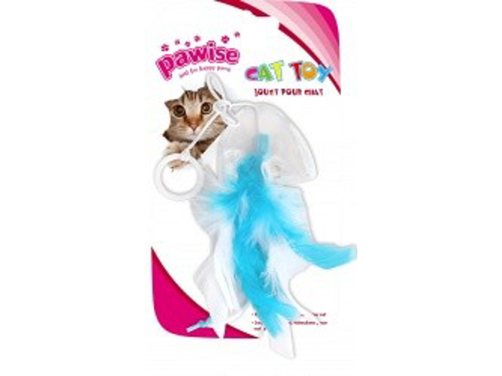 • Et stykke kattelegetøj, som er formet som en fisk som også er med elastik, plus der er tilført fjer på legetøjet for at øge opmærksomheden