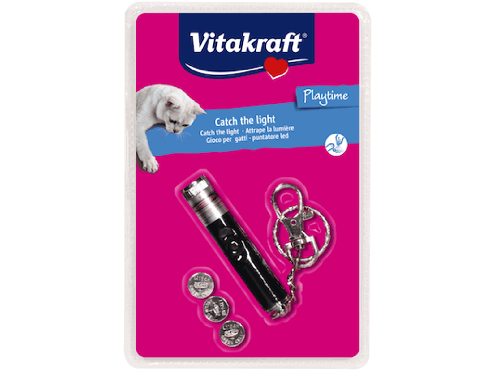 • Vitakraft Laser Pointer Catch the Light er et interaktivt kattelegetøj, der er udviklet til at stimulere kattens naturlige jagt- og legeinstinkt. Laserpointeren projicerer et tydeligt fiskemotiv, som effektivt fanger kattens opmærksomhed og opfordrer til aktiv leg.