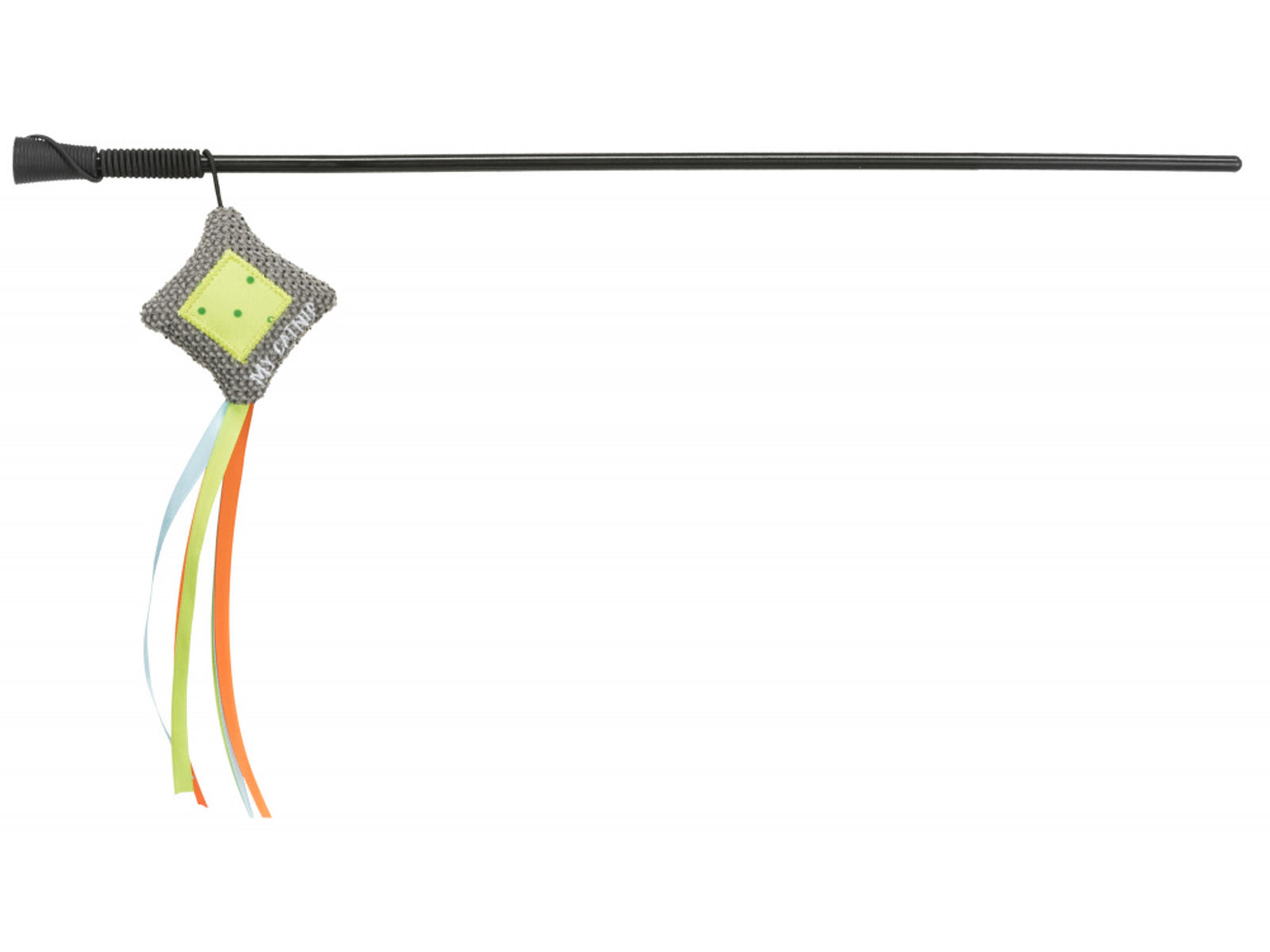 Denne drillepind fra Trixie har et sort håndtag af plastik, farvestrålende polyester strimler for enden, og den lille sjove vævede sæk, som er god for din kat at sætte kløerne i, når den skal fange den.