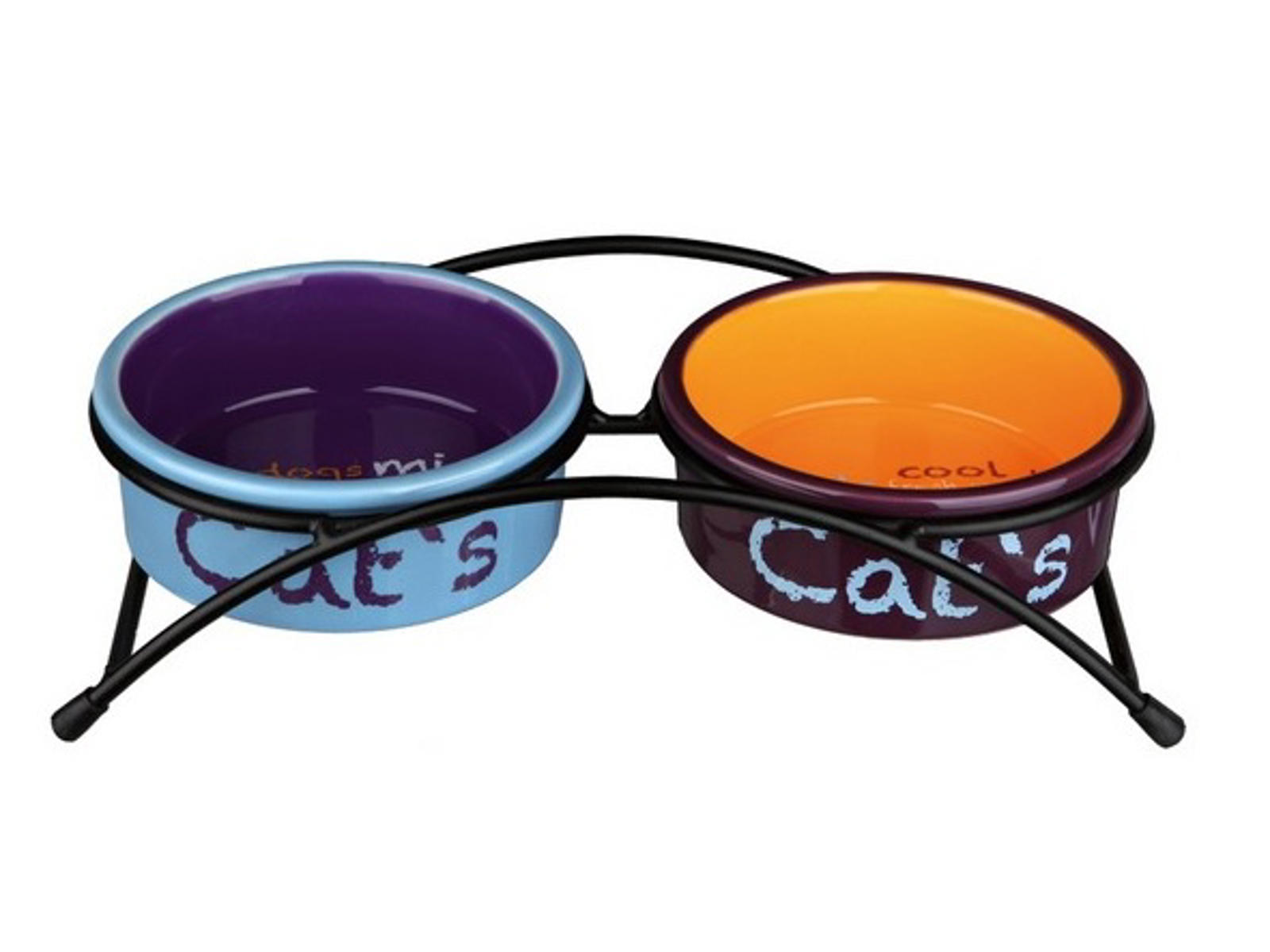 2 Keramik skål med stativ som gør at Katten ikke skal bukke sig ned efter sit foder eller vand.