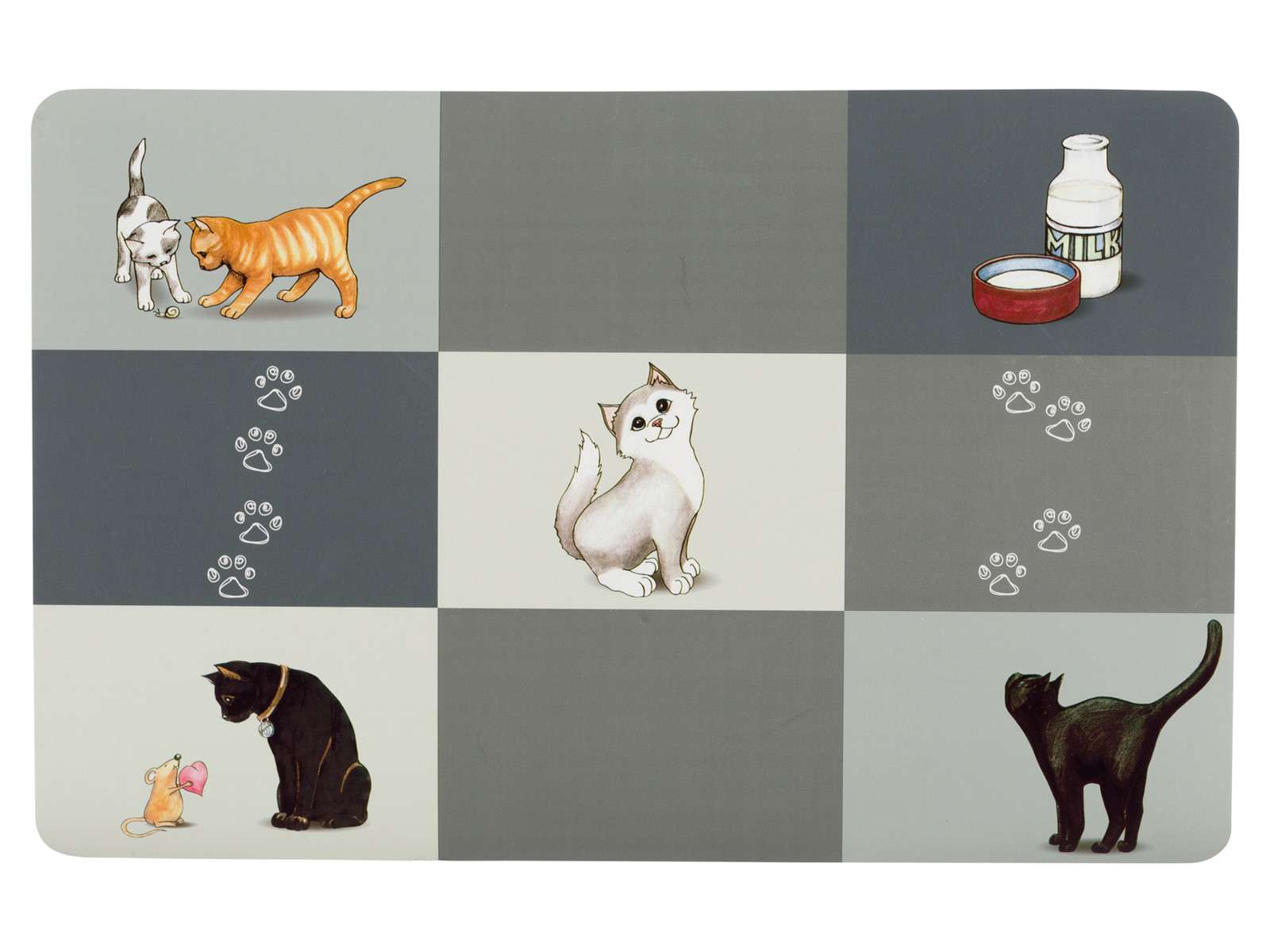 Flot spisemåtte fra Trixie med kattemotiver, der beskytter gulvet mod mad og vand fra kattens skåle.