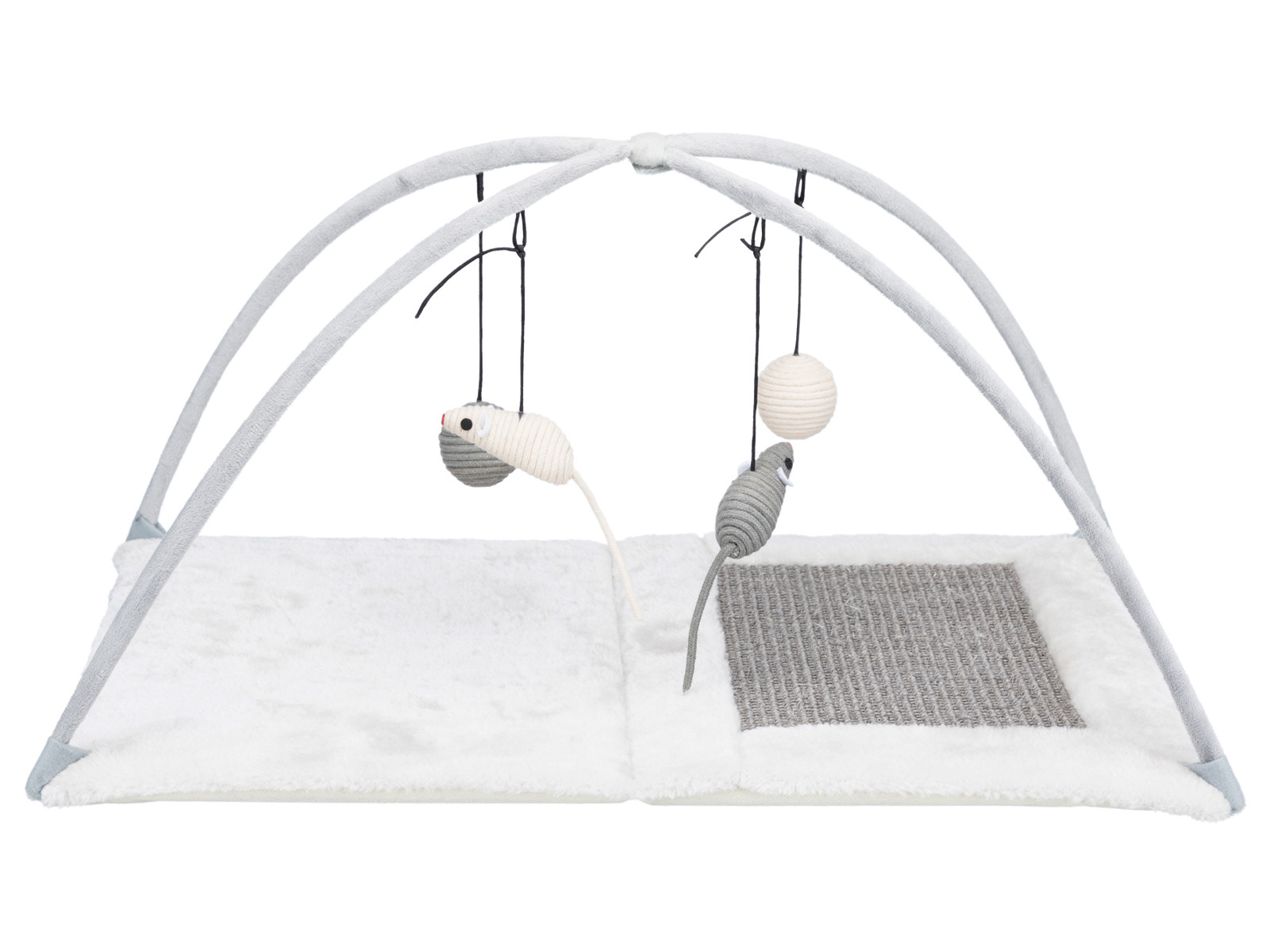 Med denne kradsemåtte fra Trixie får du en kradsemåtte og legetøj i ét. Måtten kommer i neutrale farver som hvid og grå, så den vil passe ind i ethvert hjem.
