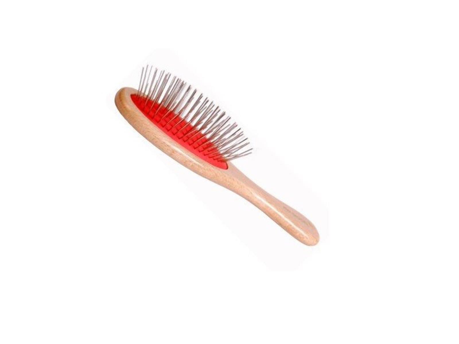 • Børste med afrundede pigge i rustfrit stål.Denne børste anvendes til udredning af langhårsracer, da de lange pigge kommer godt ned i underulden hos disse og derfor gør børstningen nemmere. Pelsen på hunde bør mindst en gang om ugen børstes grundigt igennem. Er der "klumper" af hår, bør disse redes ud. God pelspleje til dit langhårede kæledyr. Skaftet er af træ og giver et godt greb.